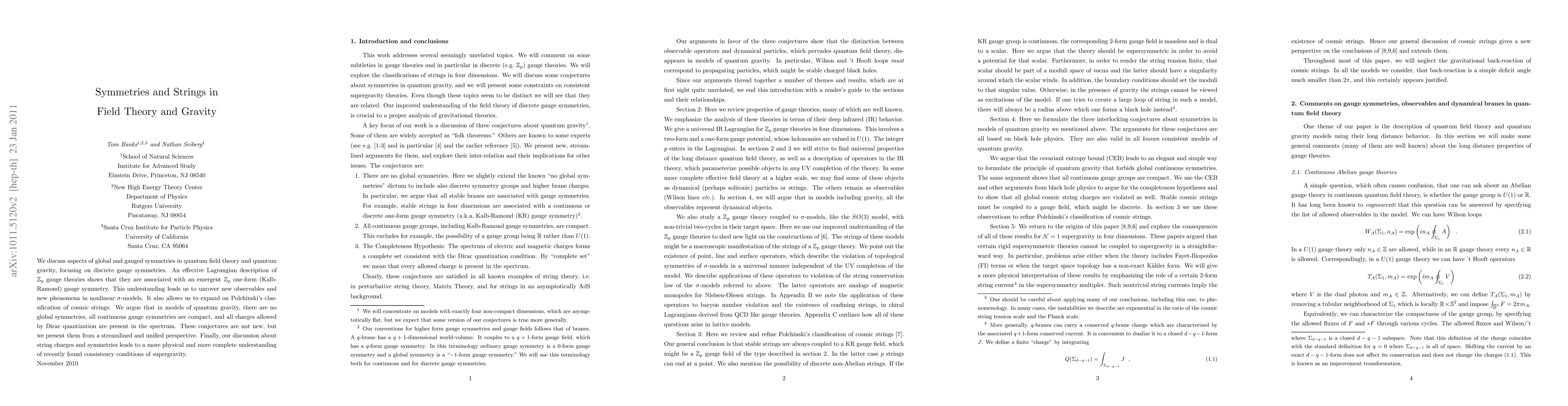 This paper explores global and gauged symmetries in quantum field theory and gravity, particularly focusing on discrete gauge symmetries and their implications for $\Z_p$ gauge theories and cosmic strings. It presents a unified perspective on these symmetries and their emergent properties, leading to new insights into nonlinear $\sigma$-models and supergravity consistency conditions.