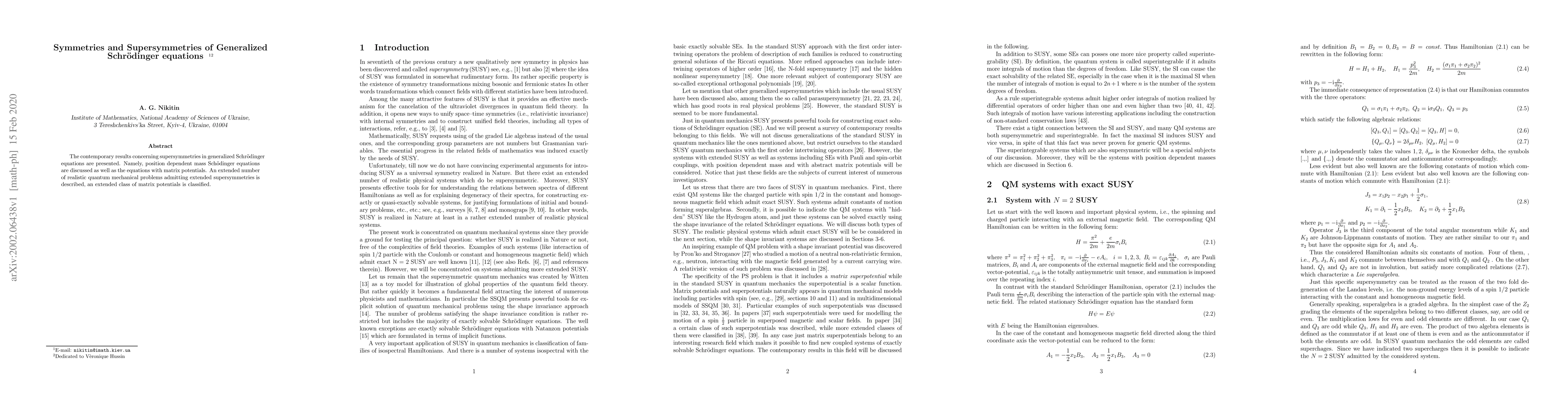 In this survey the contemporary results concerning supersymmetries in generalized Schr\"odinger equations are presented. Namely, position dependent mass Sch\"odinger equations are discussed as well as the equations with matrix potentials. An extended number of realistic quantum mechanical problems admitting extended supersymmetries is described, an extended class of matrix potentials is classified.