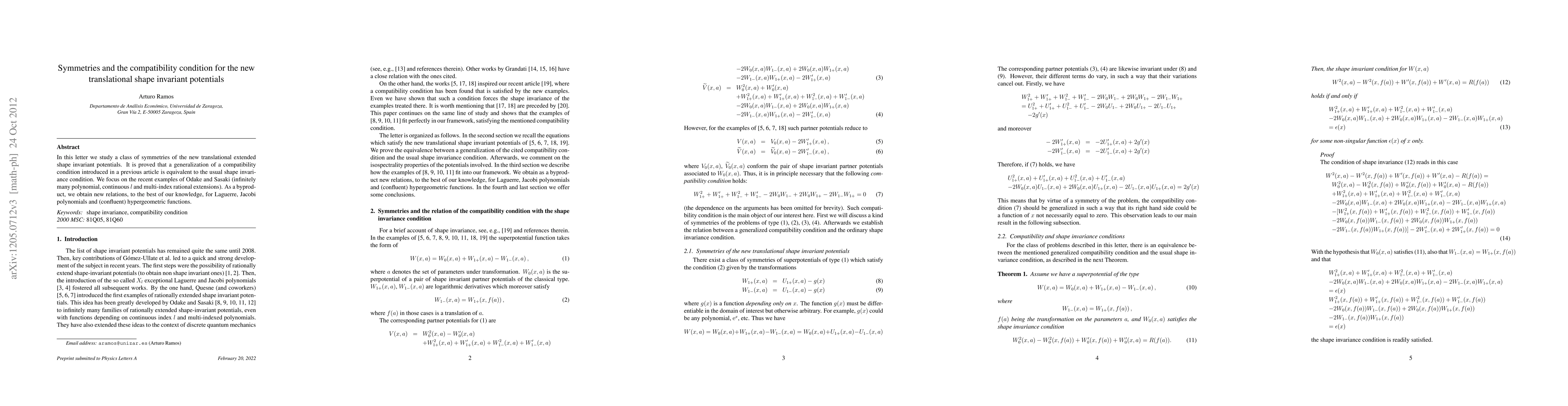 In this letter we study a class of symmetries of the new translational extended shape invariant potentials. It is proved that a generalization of a compatibility condition introduced in a previous article is equivalent to the usual shape invariance condition. We focus on the recent examples of Odake and Sasaki (infinitely many polynomial, continuous $l$ and multi-index rational extensions). As a byproduct, we obtain new relations, to the best of our knowledge, for Laguerre, Jacobi polynomials and (confluent) hypergeometric functions.