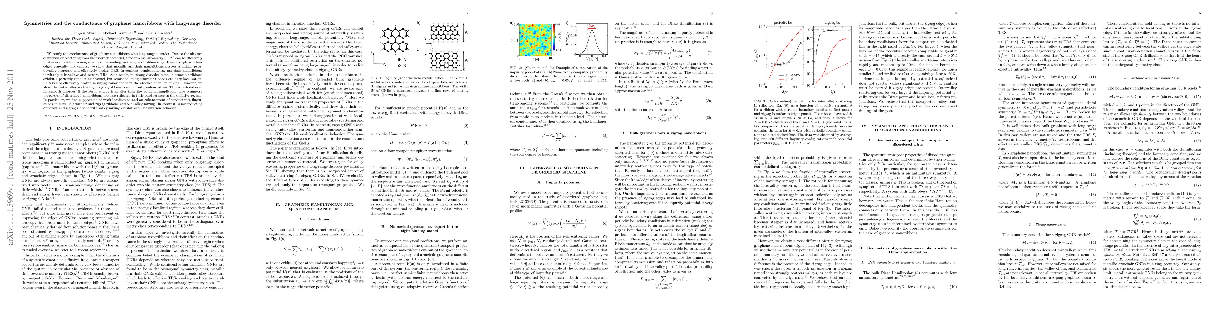 This paper investigates how long-range disorder affects the conductance of graphene nanoribbons, revealing that metallic armchair ribbons exhibit broken time-reversal symmetry and perfect conductivity, while semiconducting ones restore it and show localization. Zigzag ribbons also lose time-reversal symmetry unless intervalley scattering occurs, which restores symmetry when the Fermi energy is below the potential amplitude.