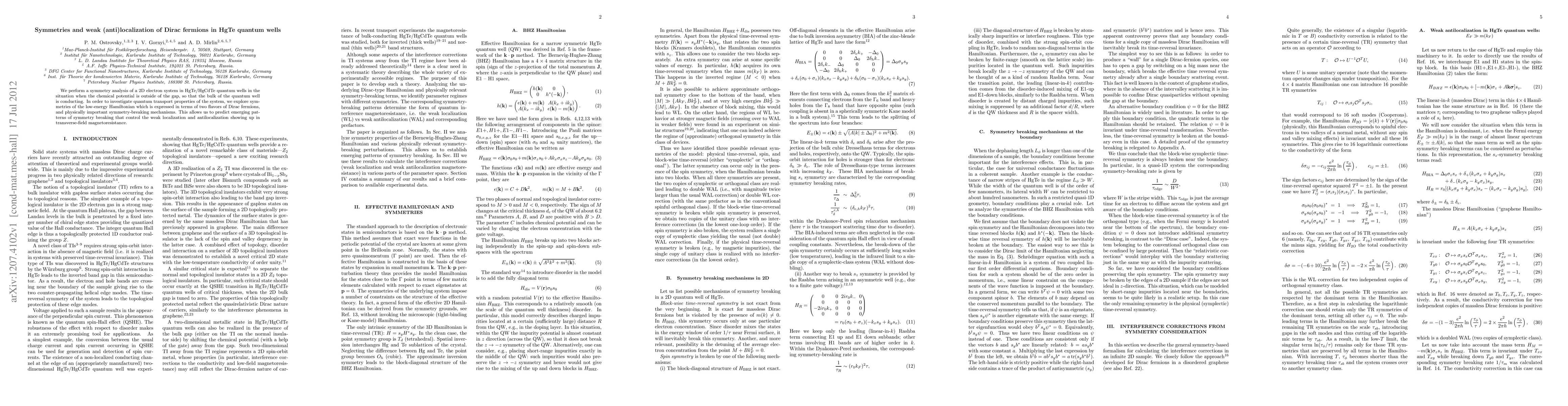 This study analyzes the symmetries of a 2D electron system in HgTe/HgCdTe quantum wells, focusing on Dirac fermions when the chemical potential is outside the gap. It predicts patterns of symmetry breaking influencing weak localization and antilocalization effects in transverse-field magnetoresistance.