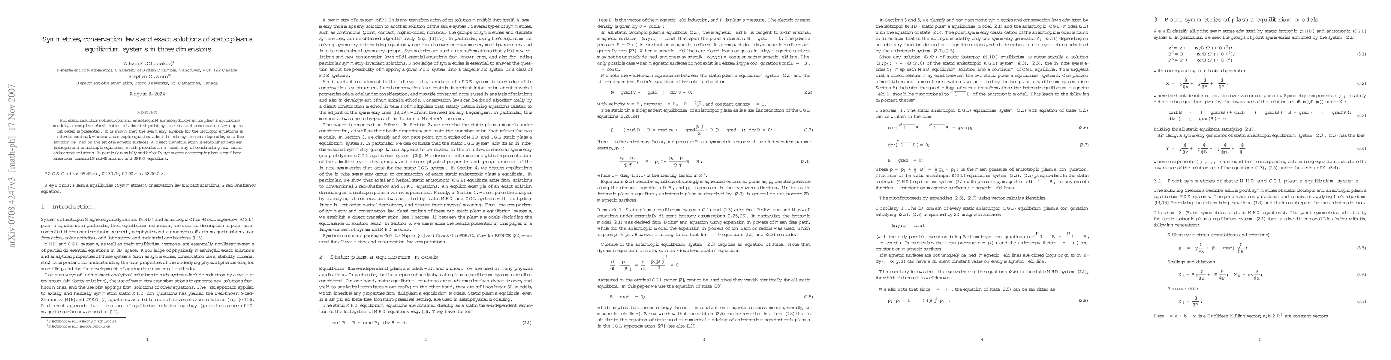 This paper classifies point symmetries and conservation laws for static plasma equilibrium systems in Magnetohydrodynamics, revealing finite symmetries in isotropic models and infinite symmetries in anisotropic models. It also establishes a transformation between isotropic and anisotropic equations to construct new exact solutions, including axially and helically symmetric equilibria.
