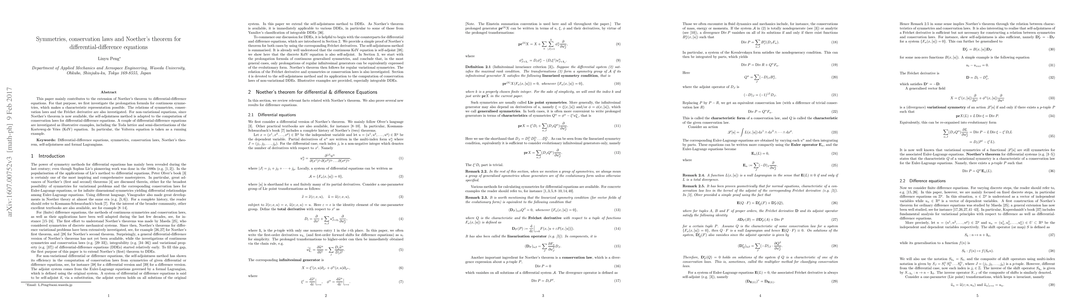 This paper extends Noether's theorem to differential-difference equations, exploring the prolongation formula for continuous symmetries and the relationship between symmetries, conservation laws, and the Fr\'echet derivative. The self-adjointness method is adapted for computing conservation laws, illustrated through examples like the Toda lattice and semi-discretised KdV equation.
