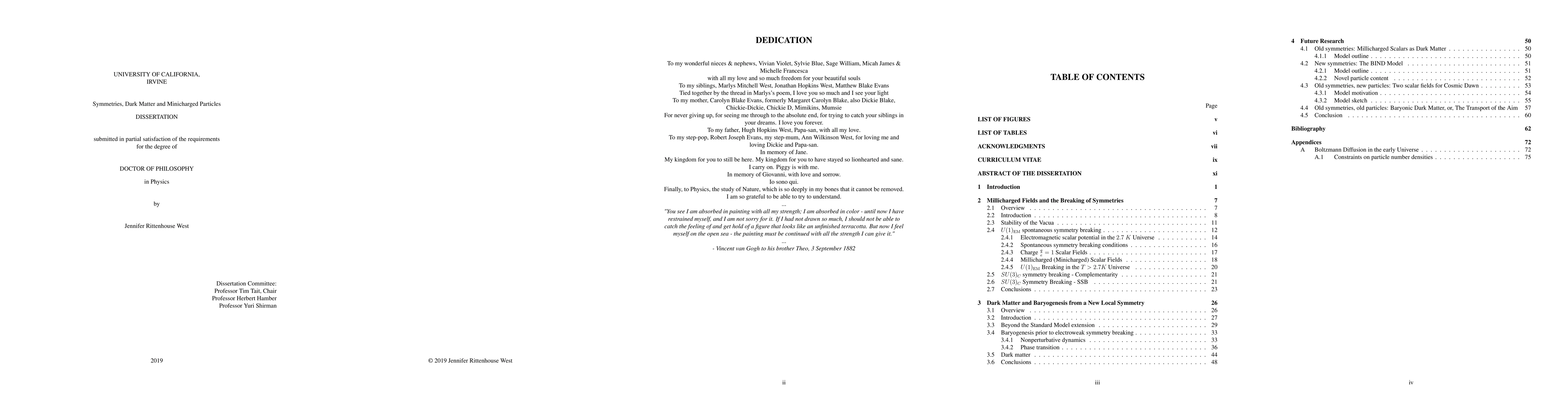 This theoretical particle physics thesis is an investigation into old and new symmetries of Nature. Known symmetries and conservation laws serve as a guide for dark and visible sector model building. New symmetries of Nature are proposed, broken and subsequently reinstated at high temperatures in order to discover well-motivated particle physics models for cosmological observations implying the existence of a dark sector. Candidate processes for creation of a non-primordial matter/antimatter asymmetry result from out of equilibrium spontaneous breaking of these symmetries in the early Universe. Using the Standard Model of particle physics as a foundation with minimal new degrees of freedom, minicharged and millicharged particles emerge from a proposed spontaneous breaking of known symmetries. Experimental predictions and constraints for such dark matter candidates are given briefly here and outlined for future work. Constraints on neutrino-like particles found in the debris of broken local (gauge) symmetries are given, a subset of which are sterile and appear to be viable particle dark matter candidates. A failed baryonic dark matter candidate became a candidate to solve an outstanding nuclear structure problem, the EMC effect.