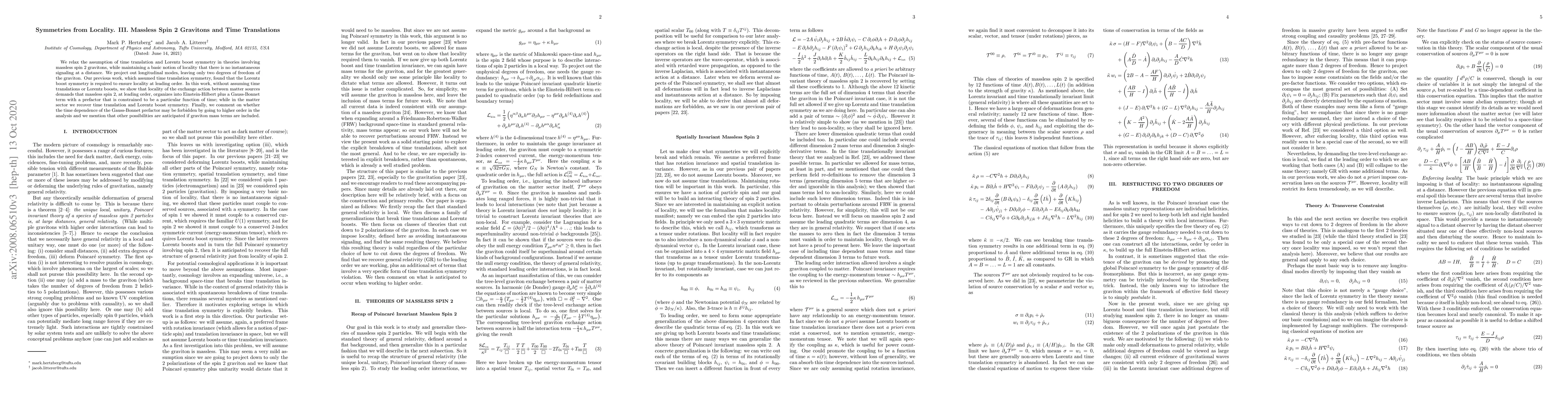 This research explores massless spin 2 gravitons without assuming time translation or Lorentz boost symmetry, maintaining locality through projection of longitudinal modes. It reveals that locality in the matter-graviton exchange necessitates Einstein-Hilbert and Gauss-Bonnet terms, with a time-dependent prefactor for the Gauss-Bonnet term. Time translation and Lorentz boost symmetry re-emerge in the matter sector, with considerations on higher-order constraints and potential graviton mass term implications.