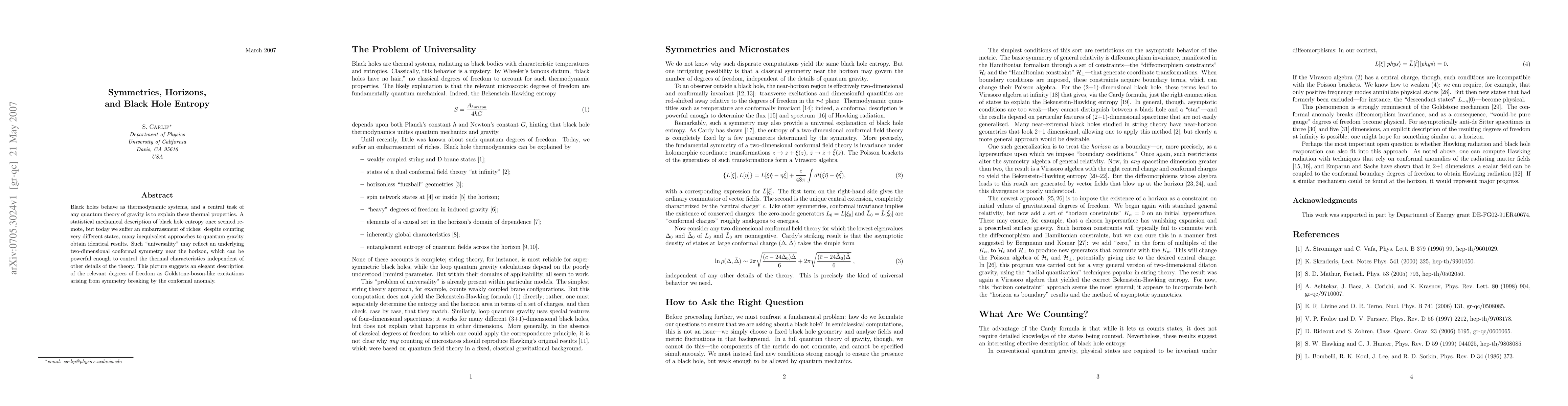 Black holes behave as thermodynamic systems, and a central task of any quantum theory of gravity is to explain these thermal properties. A statistical mechanical description of black hole entropy once seemed remote, but today we suffer an embarrassment of riches: despite counting very different states, many inequivalent approaches to quantum gravity obtain identical results. Such ``universality'' may reflect an underlying two-dimensional conformal symmetry near the horizon, which can be powerful enough to control the thermal characteristics independent of other details of the theory. This picture suggests an elegant description of the relevant degrees of freedom as Goldstone-boson-like excitations arising from symmetry breaking by the conformal anomaly.