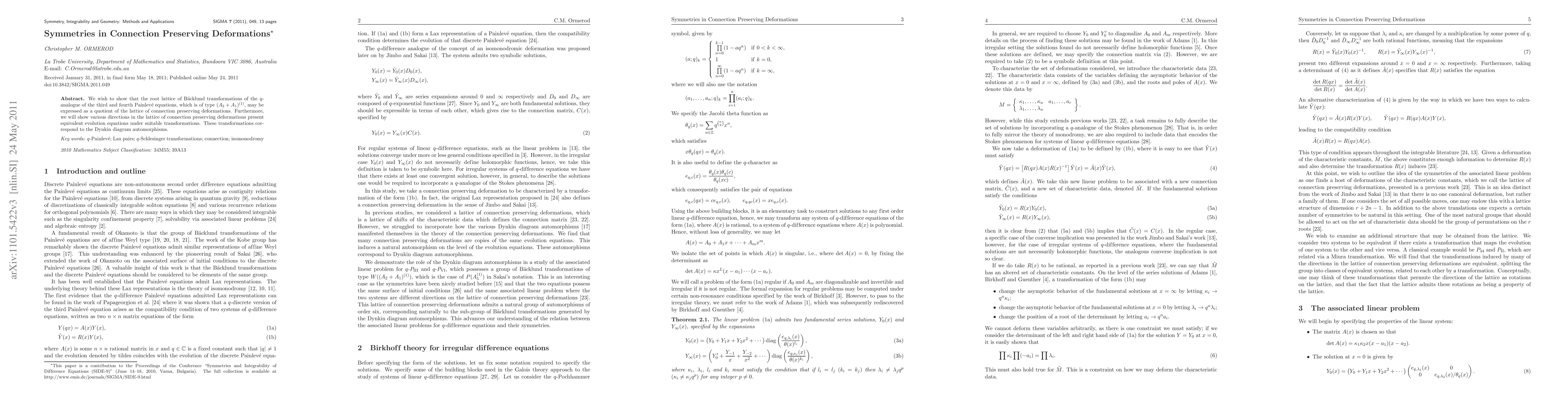 We wish to show that the root lattice of B\"acklund transformations of the $q$-analogue of the third and fourth Painlev\'e equations, which is of type $(A_2+ A_1)^{(1)}$, may be expressed as a quotient of the lattice of connection preserving deformations. Furthermore, we will show various directions in the lattice of connection preserving deformations present equivalent evolution equations under suitable transformations. These transformations correspond to the Dynkin diagram automorphisms.