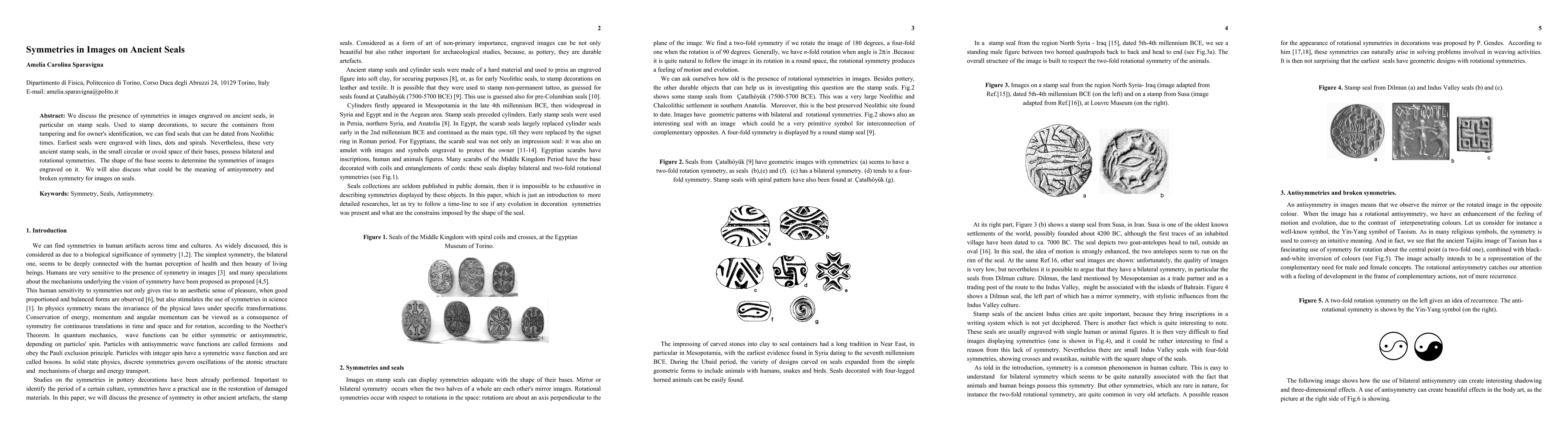 This paper explores the presence of bilateral and rotational symmetries in images engraved on ancient stamp seals, dating back to Neolithic times, and examines how the shape of the seal's base influences the symmetry of the designs. The study also delves into the potential meanings behind antisymmetry and broken symmetry in these engravings.