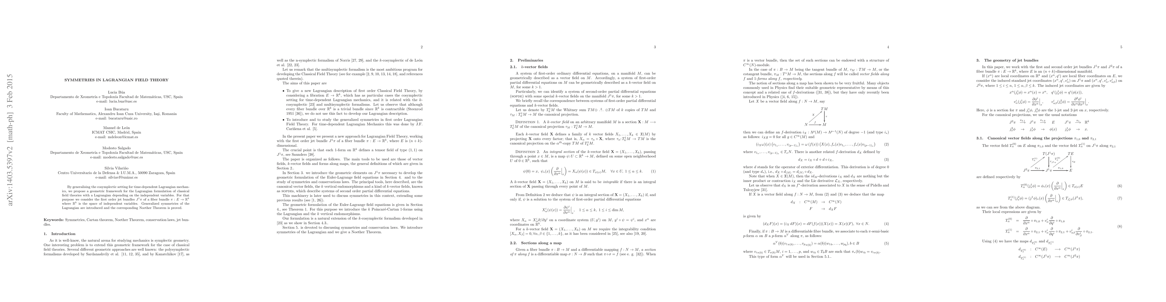 Researchers propose a geometric framework for classical field theories using generalized symmetries of the Lagrangian, introducing a new Noether Theorem for time-dependent Lagrangian mechanics.