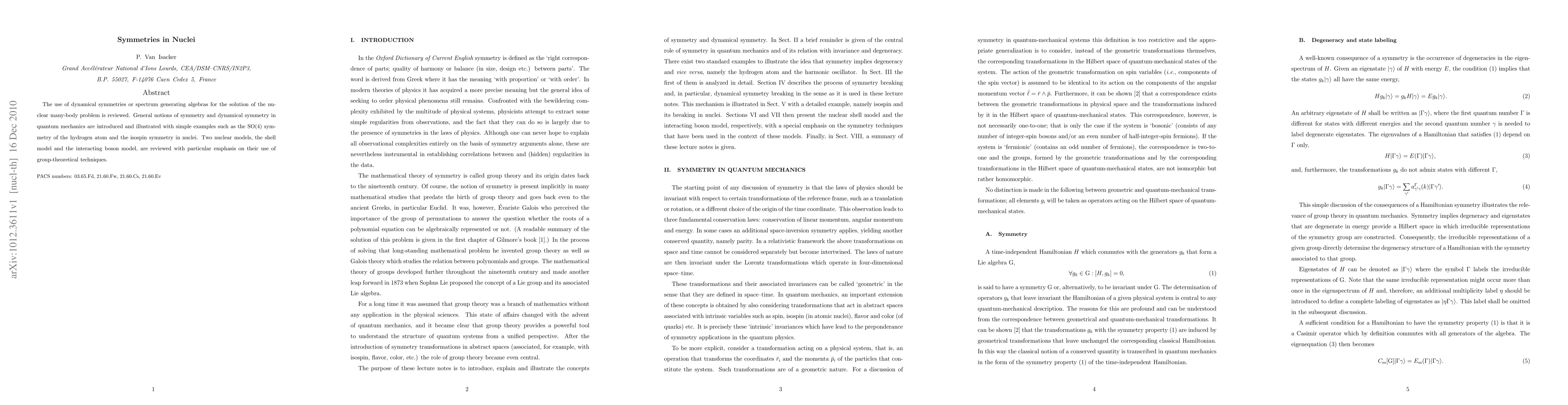 This paper reviews the application of dynamical symmetries and spectrum generating algebras in solving nuclear many-body problems, introducing key concepts in quantum mechanics and illustrating with examples like SO(4) symmetry in the hydrogen atom and isospin symmetry in nuclei, followed by a review of the shell model and the interacting boson model with group-theoretical techniques.