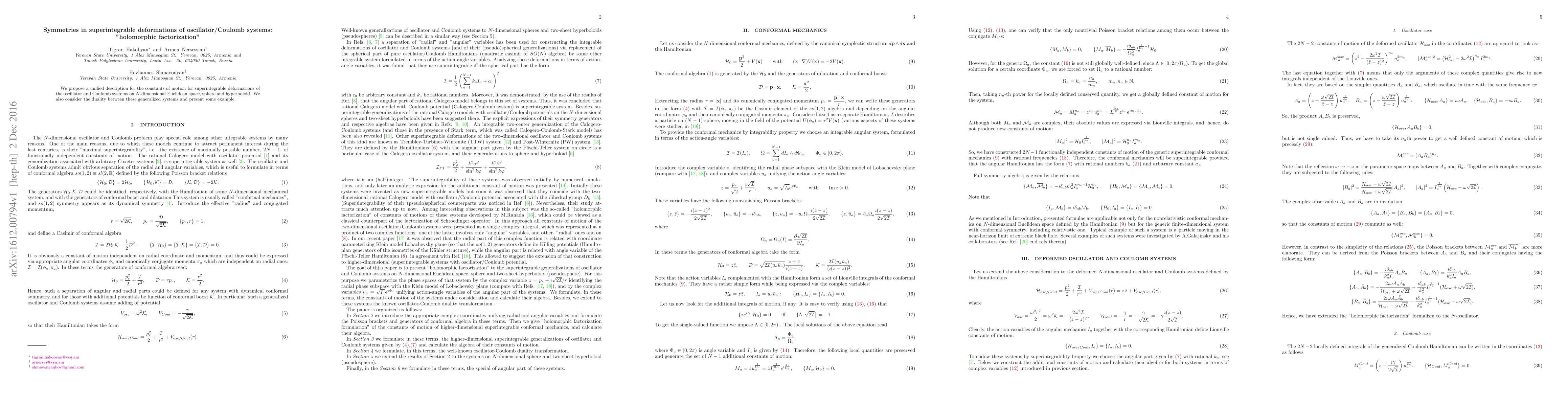We propose a unified description for the constants of motion for superintegrable deformations of the oscillator and Coulomb systems on N-dimensional Euclidean space, sphere and hyperboloid. We also consider the duality between these generalized systems and present some example.