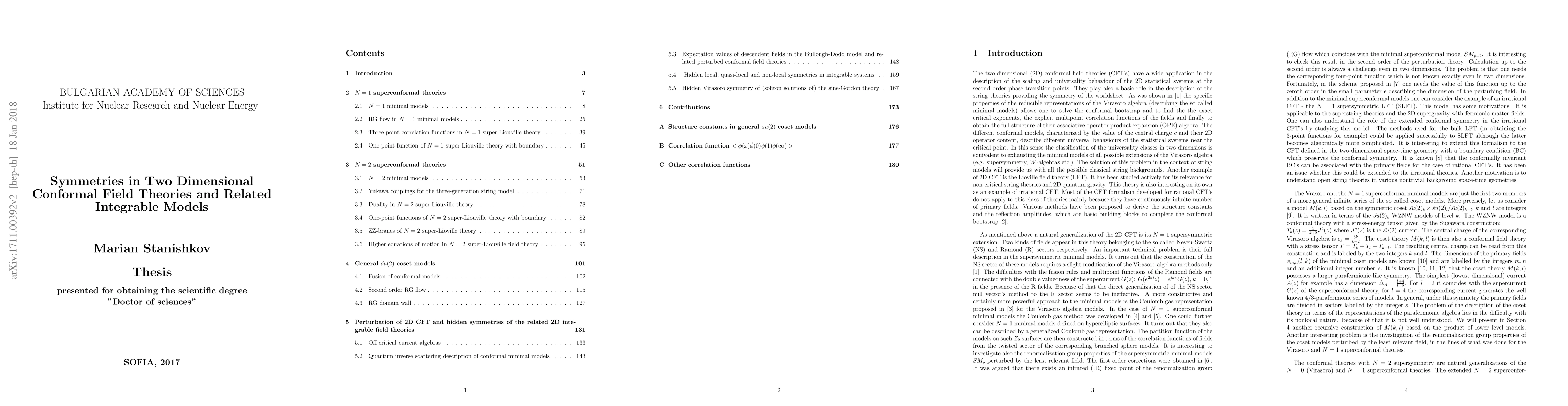 This paper explores symmetries in 2D N=1 and N=2 superconformal field theories, extending to SU(2) coset models and their renormalization group properties. It also identifies and proposes the implementation of additional symmetries in related integrable models.