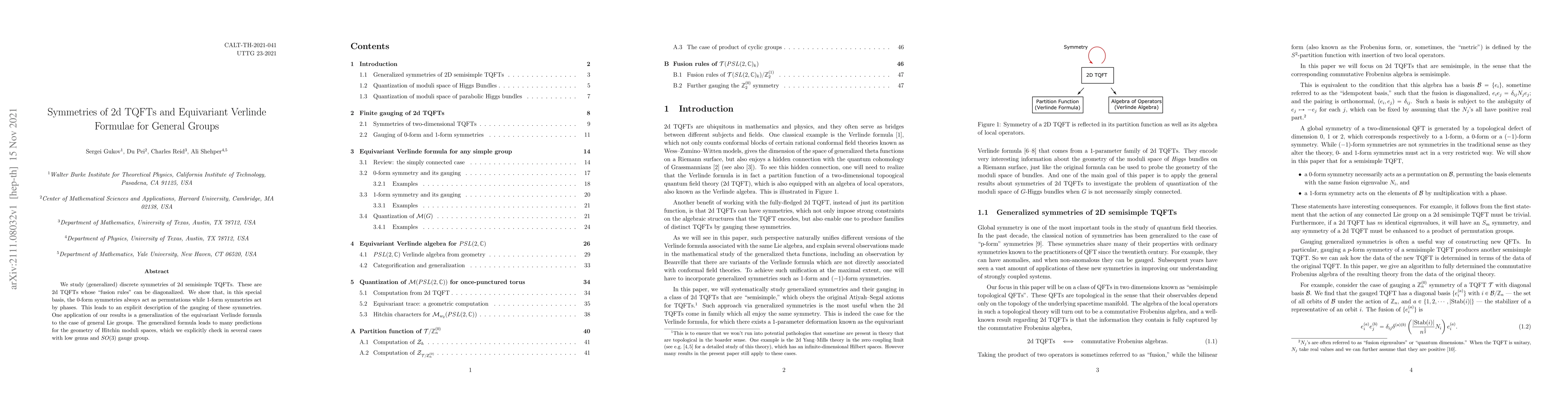 This paper investigates the symmetries in 2d semisimple topological quantum field theories (TQFTs), showing that 0-form symmetries permute and 1-form symmetries phase-shift in a diagonalizable basis. It extends the equivariant Verlinde formula to general Lie groups, providing predictions for the geometry of Hitchin moduli spaces verified in specific low-genus and SO(3) gauge cases.
