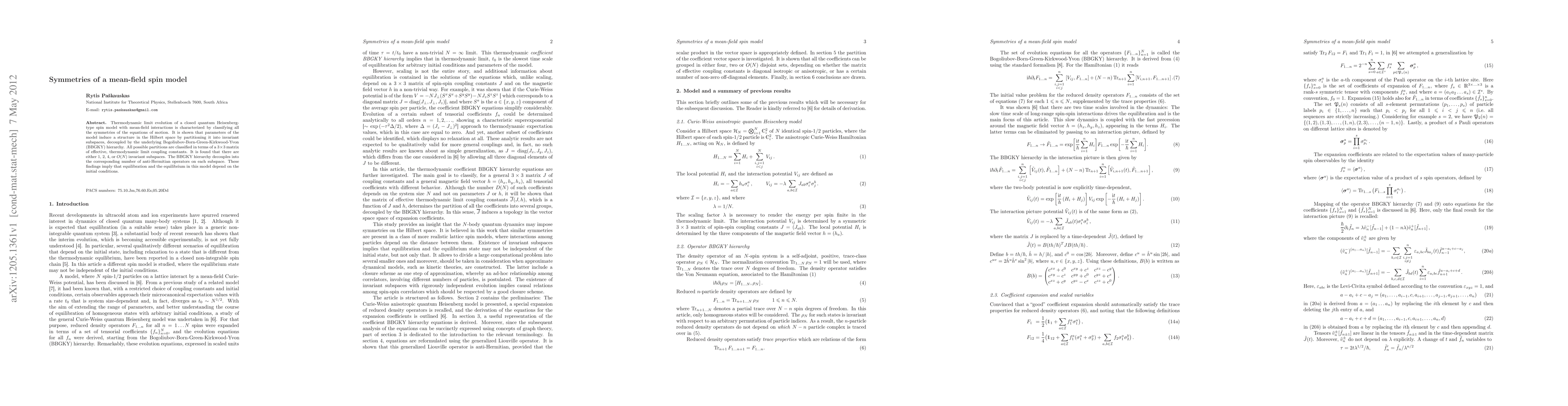 Thermodynamic limit evolution of a closed quantum Heisenberg-type spin model with mean-field interactions is characterized by classifying all the symmetries of the equations of motion. It is shown that parameters of the model induce a structure in the Hilbert space by partitioning it into invariant subspaces, decoupled by the underlying Bogoliubov-Born-Green-Kirkwood-Yvon (BBGKY) hierarchy. All possible partitions are classified in terms of a $3\times3$ matrix of effective, thermodynamic limit coupling constants. It is found that there are either 1, 2, 4, or O(N) invariant subspaces. The BBGKY hierarchy decouples into the corresponding number of anti-Hermitian operators on each subspace. These findings imply that equilibration and the equilibrium in this model depend on the initial conditions.