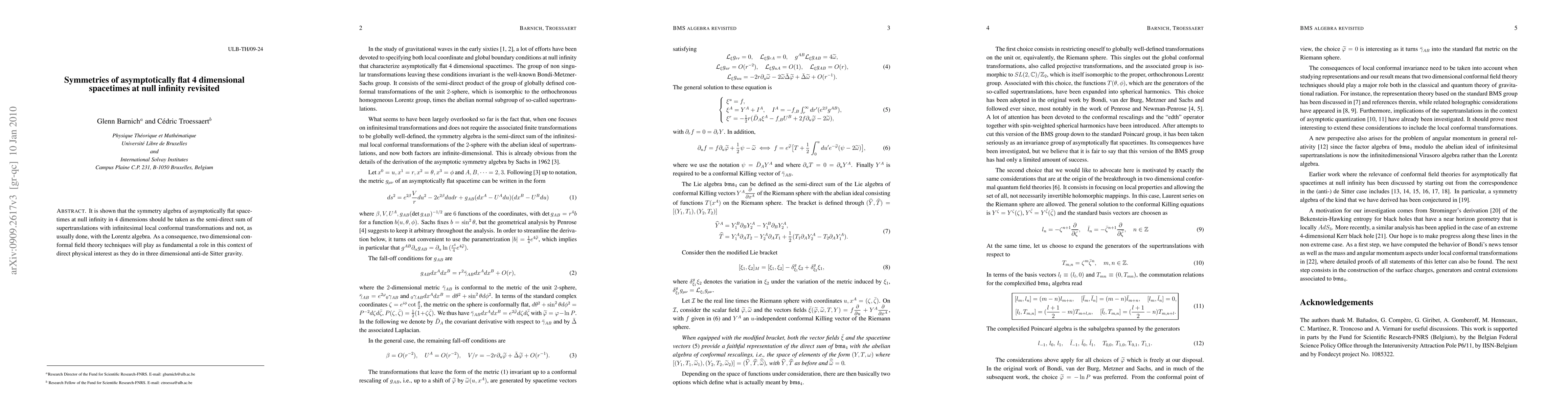 This paper argues for a revised symmetry algebra for asymptotically flat 4D spacetimes at null infinity, proposing it as a semi-direct sum of supertranslations and infinitesimal local conformal transformations, rather than the traditional Lorentz algebra. This shift implies a significant role for two-dimensional conformal field theory in understanding these spacetimes.