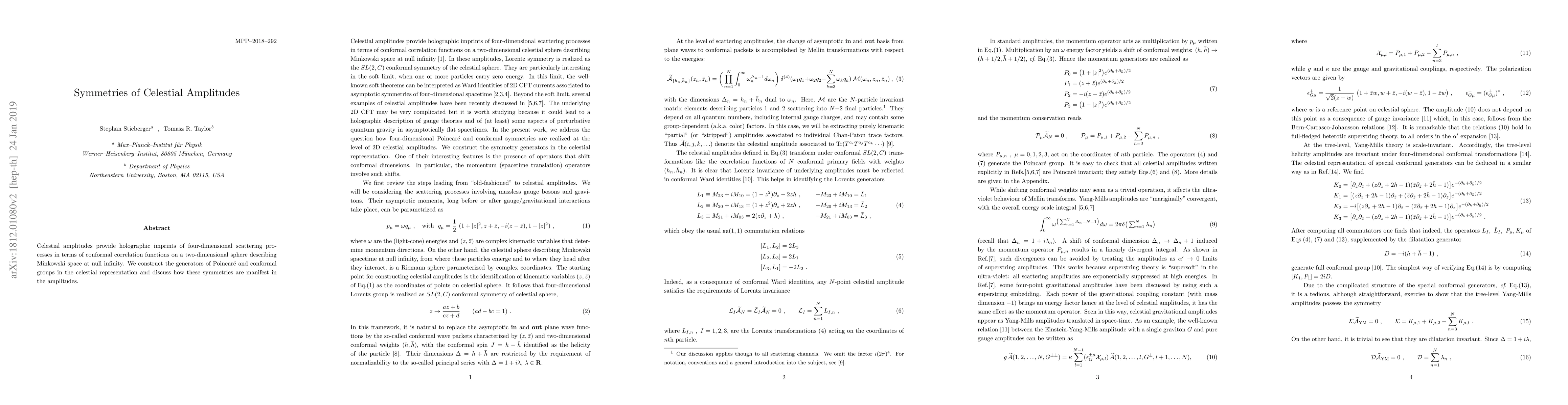 Summary: This paper constructs generators of Poincare and conformal groups in the celestial representation, demonstrating how symmetries of four-dimensional scattering processes are holographically encoded in conformal correlation functions on the two-dimensional sphere at null infinity.