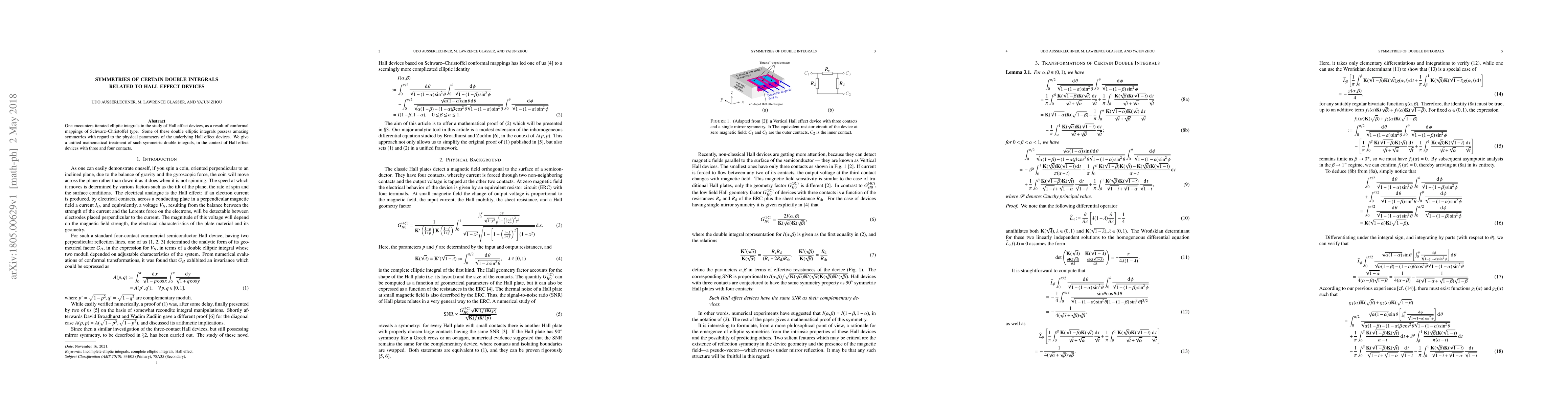 This paper explores the symmetries of double elliptic integrals arising from conformal mappings in Hall effect devices, providing a unified mathematical treatment for devices with three and four contacts. The study reveals remarkable symmetries in these integrals related to the physical parameters of the devices.