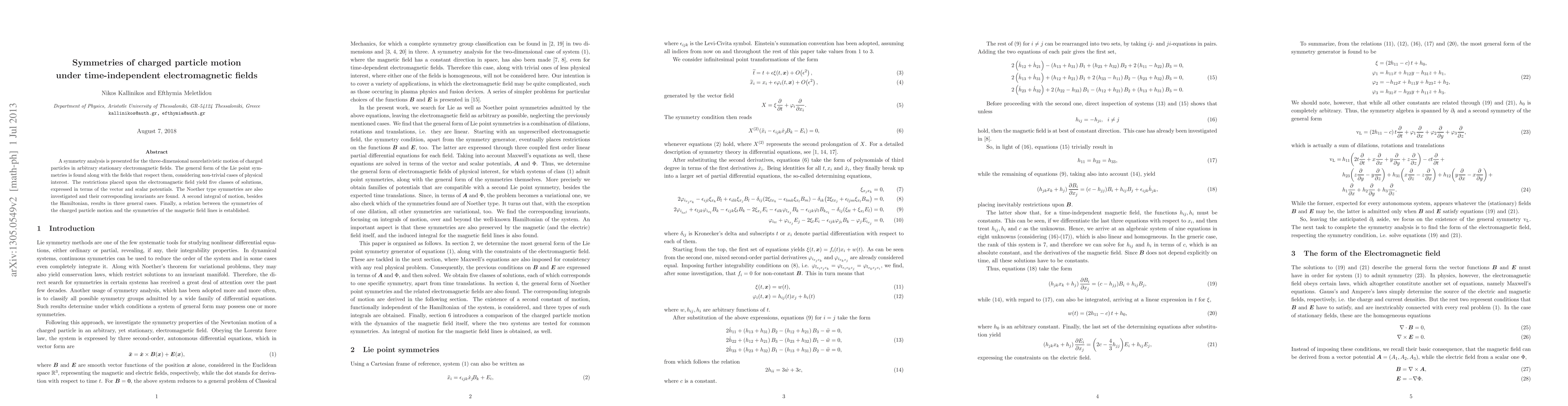 This paper conducts a symmetry analysis of the three-dimensional motion of charged particles in stationary electromagnetic fields, identifying Lie point symmetries and corresponding invariant solutions. It also explores Noether type symmetries and finds a second integral of motion, establishing a connection between particle motion symmetries and magnetic field line symmetries.