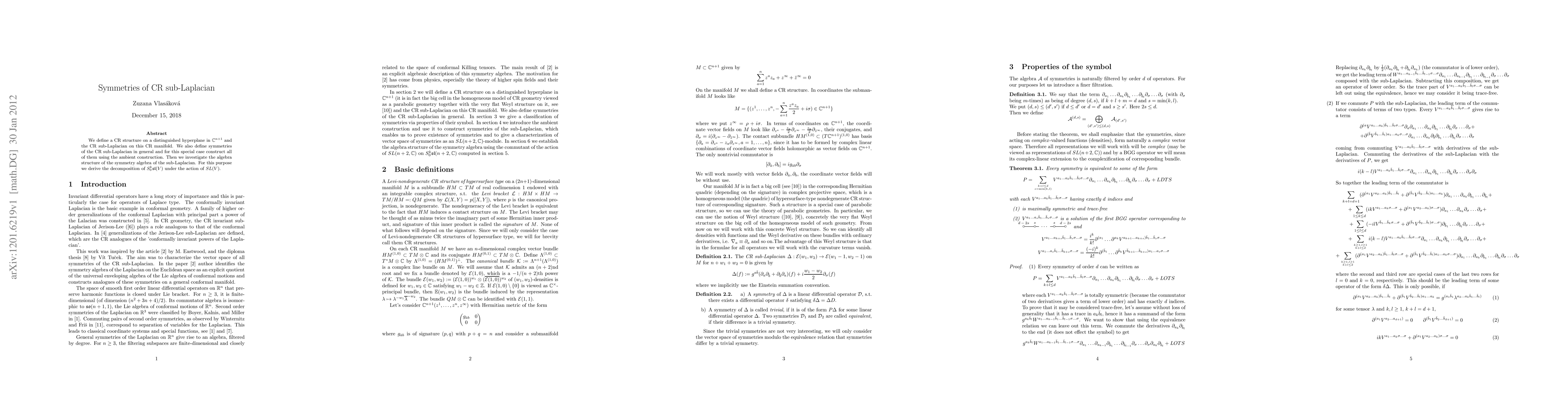 We define a CR structure on a distinguished hyperplane in $\mathbb{C}^{n+1}$ and the CR sub-Laplacian on this CR manifold. We also define symmetries of the CR sub-Laplacian in general and for this special case construct all of them using the ambient construction. Then we investigate the algebra structure of the symmetry algebra of the sub-Laplacian. For this purpose we derive the decomposition of $S^{k}_{0}\mathfrak{sl}(V)$ under the action of $SL(V)$.