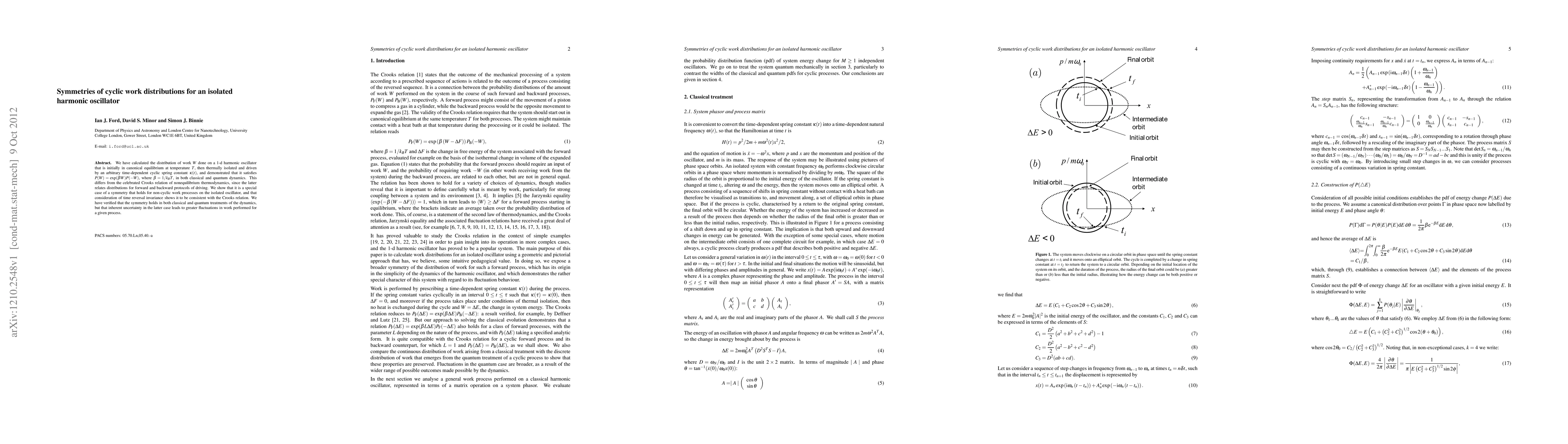 This paper investigates the distribution of work done on a harmonic oscillator subjected to cyclic driving, revealing a symmetry $P(W)=\exp(\beta W)P(-W)$ that differs from the Crooks relation. The symmetry holds for both classical and quantum dynamics, though quantum fluctuations are more pronounced.
