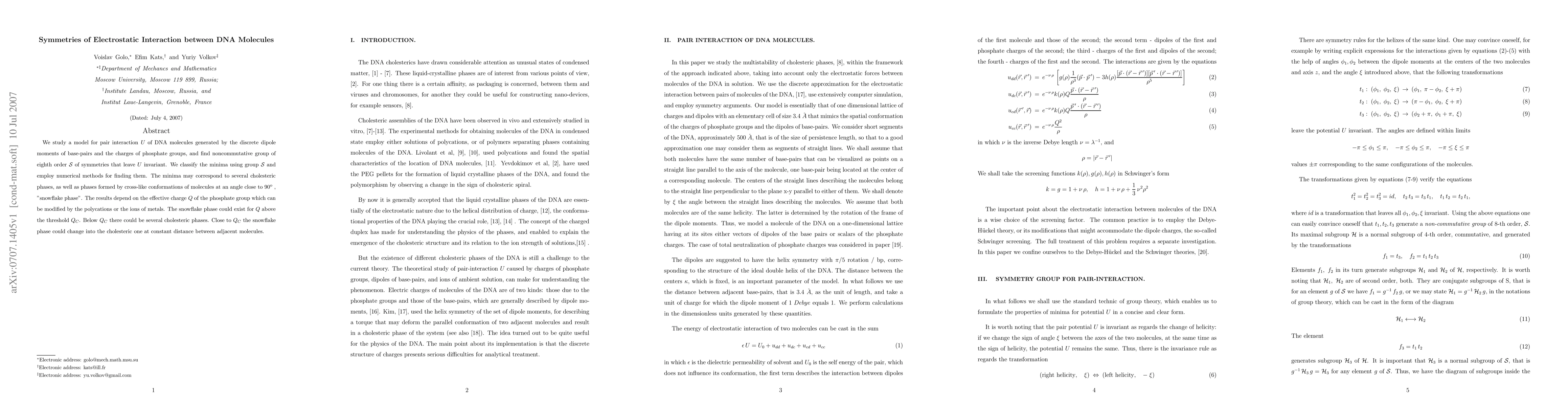 The paper introduces a mathematical framework based on symmetry group S to classify and find minima of the electrostatic interaction potential U between DNA molecules, providing insights into their self-assembly behavior.