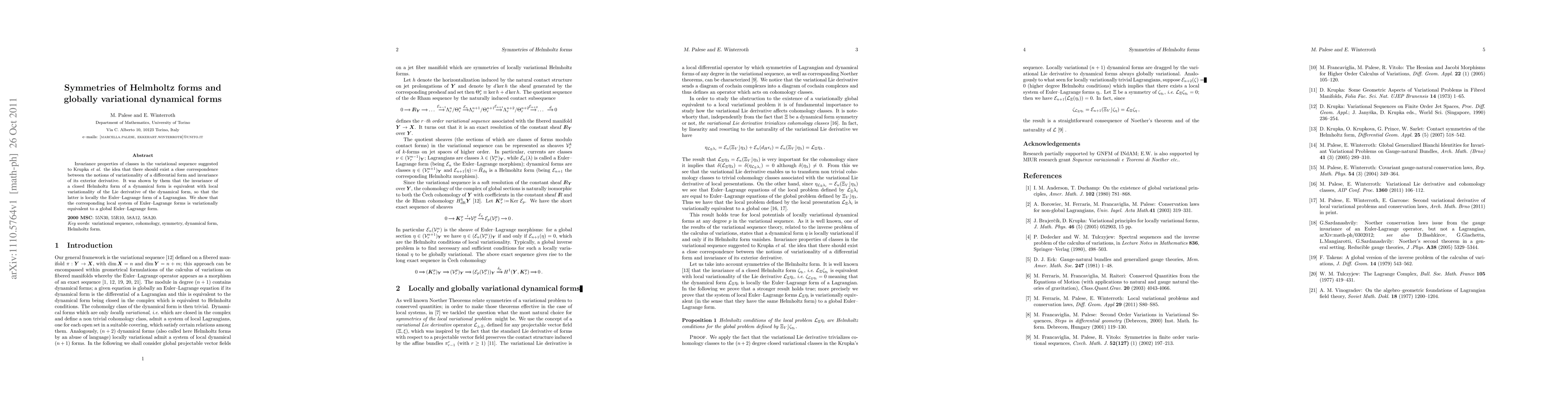 Invariance properties of classes in the variational sequence suggested to Krupka et al. the idea that there should exist a close correspondence between the notions of variationality of a differential form and invariance of its exterior derivative. It was shown by them that the invariance of a closed Helmholtz form of a dynamical form is equivalent with local variationality of the Lie derivative of the dynamical form, so that the latter is locally the Euler--Lagrange form of a Lagrangian. We show that the corresponding local system of Euler--Lagrange forms is variationally equivalent to a global Euler--Lagrange form.