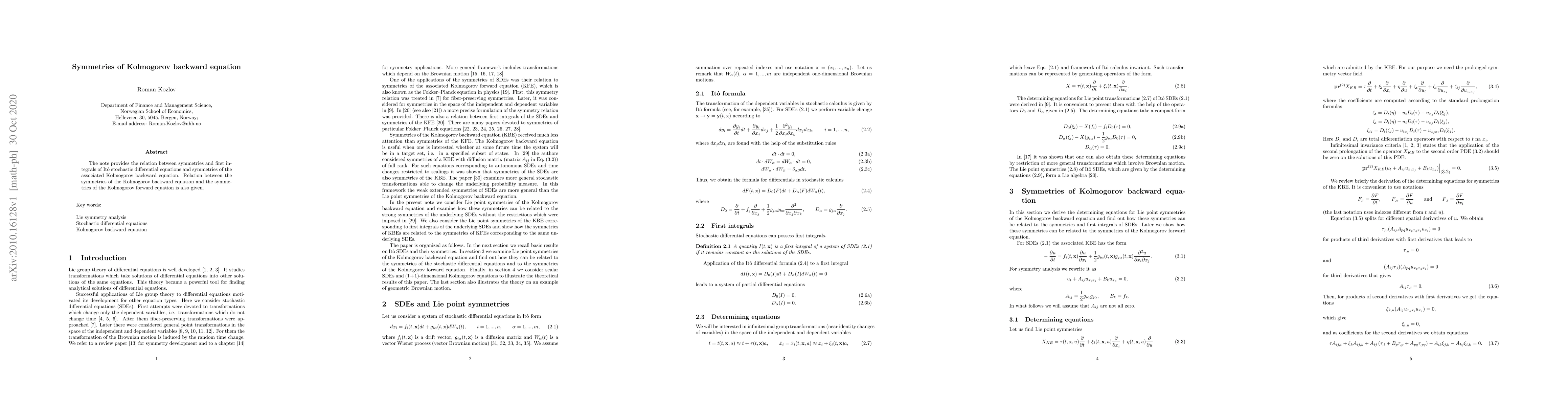 This paper explores the connection between symmetries and first integrals of Itô stochastic differential equations and the symmetries of the Kolmogorov backward equation, also establishing a relationship between the symmetries of the Kolmogorov backward and forward equations.