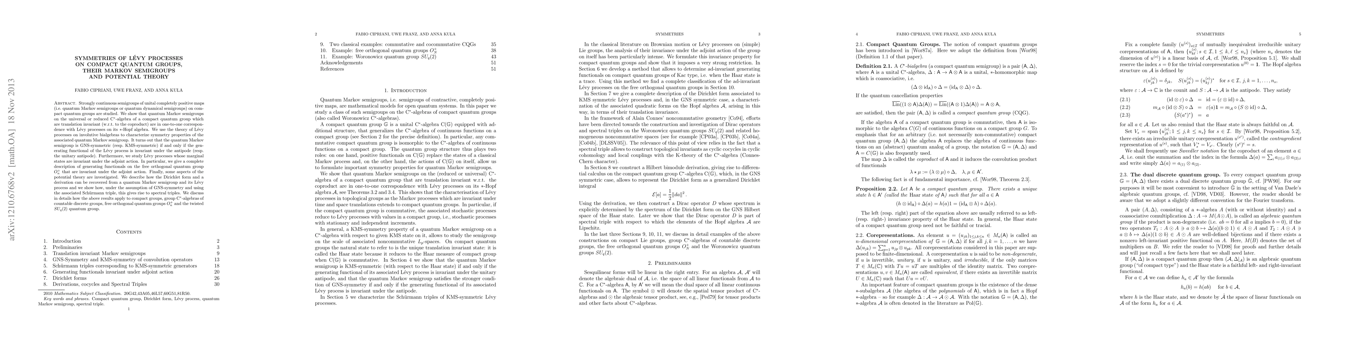 This paper studies quantum Markov semigroups on compact quantum groups, showing their correspondence with Lévy processes on their $*$-Hopf algebra. It characterizes symmetry properties of these semigroups via invariance under the antipode and explores potential theory aspects, including the recovery of Dirichlet forms and the construction of spectral triples under GNS-symmetry.