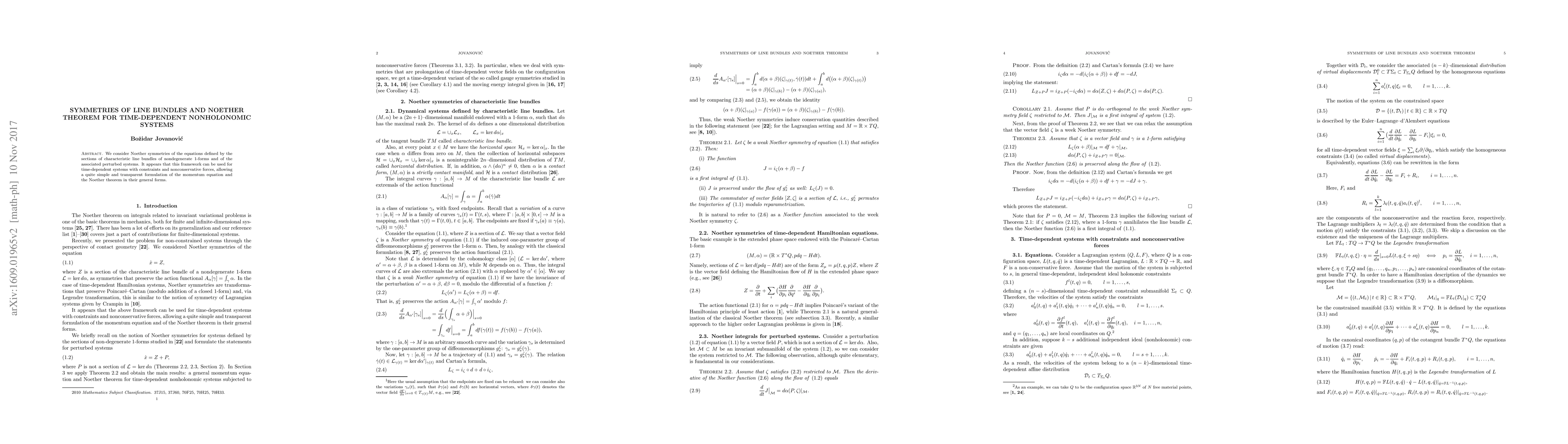 We consider Noether symmetries of the equations defined by the sections of characteristic line bundles of nondegenerate 1-forms and of the associated perturbed systems. It appears that this framework can be used for time-dependent systems with constraints and nonconservative forces, allowing a quite simple and transparent formulation of the momentum equation and the Noether theorem in their general forms.