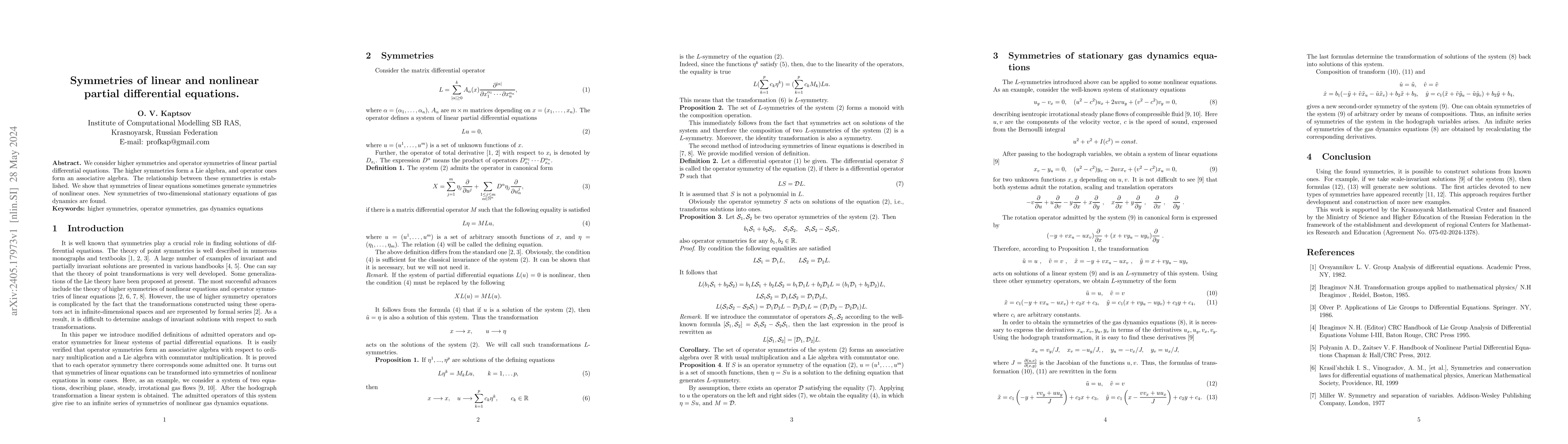 Summary: This paper investigates higher and operator symmetries in linear partial differential equations, establishing their algebraic structures and relationships. It also demonstrates how symmetries in linear equations can induce symmetries in nonlinear equations, and discovers new symmetries in two-dimensional stationary gas dynamics equations.