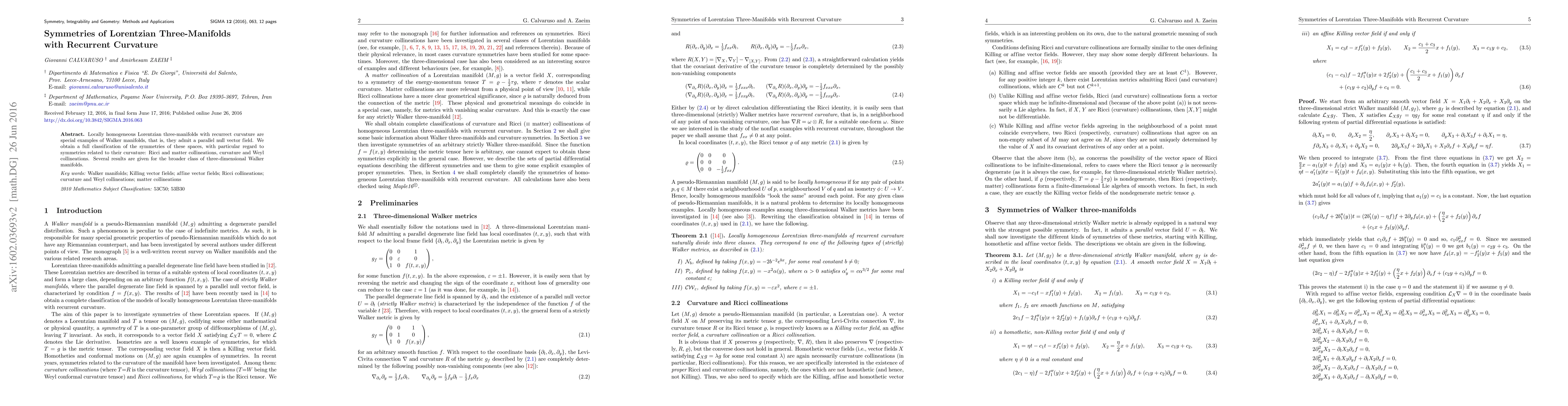This paper classifies the symmetries of locally homogeneous Lorentzian three-manifolds with recurrent curvature, focusing on Ricci, matter, curvature, and Weyl collineations. It also extends findings to the broader class of three-dimensional Walker manifolds.