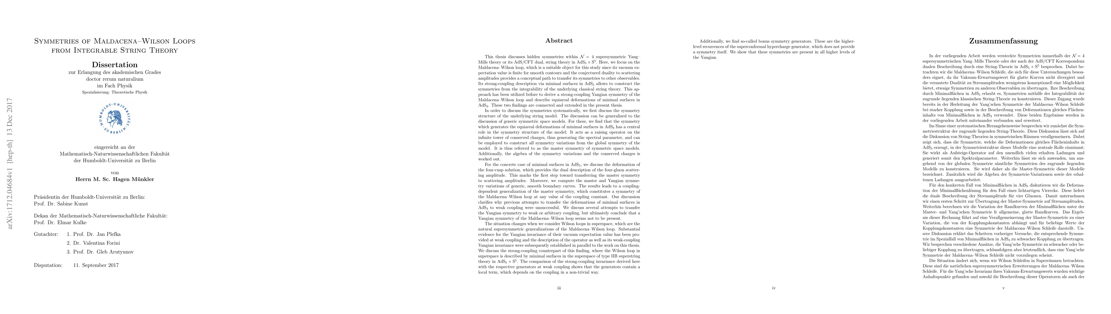 In this thesis, we investigate hidden symmetries for the Maldacena-Wilson loop in N=4 super Yang-Mills theory, mainly focusing on its strong-coupling description as a minimal surface in $AdS_5$. In the discussion of the symmetry structure of the underlying string model, we highlight the role of the master symmetry which can be employed to construct all symmetries of the model. The algebra of these symmetries is worked out. For the concrete case of minimal surfaces in $AdS_5$, we discuss the deformation of the four-cusp solution, which provides the dual description of the four-gluon scattering amplitude. This marks the first step toward transferring the master symmetry to scattering amplitudes. Moreover, we compute the master and Yangian symmetry variations of generic, smooth boundary curves. The discussion clarifies why previous attempts to transfer the deformations of minimal surfaces in $AdS_3$ to weak coupling were unsuccessful. We discuss several attempts to transfer the Yangian symmetry to weak or arbitrary coupling, but ultimately conclude that a Yangian symmetry of the Maldacena-Wilson loop seems not to be present. This is different for the natural supersymmetric generalizations of the Maldacena--Wilson loop, Wilson loops in superspace. Their one-loop expectation value is known to be Yangian invariant. We discuss the strong-coupling counterpart of this finding by considering minimal surfaces in the superspace of type IIB superstring theory in $AdS_5 \times S^5$. The comparison of the strong-coupling invariance derived here with the weak-coupling generators shows that the local term must depend on the coupling in a non-trivial way. Additionally, we show that the higher-level recurrences of the hypercharge generator, the so-called bonus symmetries, are present in all higher levels of the Yangian.