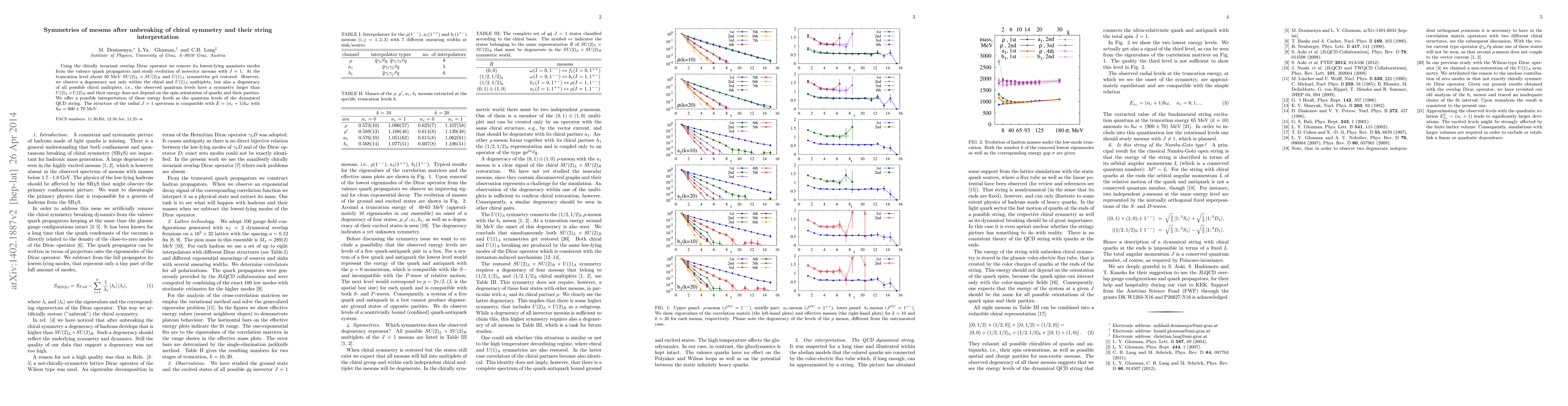 Using the chirally invariant overlap Dirac operator we remove its lowest-lying quasizero modes from the valence quark propagators and study evolution of isovector mesons with J=1. At the truncation level about 50 MeV SU(2)_L \times SU(2)_R and U(1)_A symmetries get restored. However, we observe a degeneracy not only within the chiral and U(1)_A multiplets, but also a degeneracy of all possible chiral multiplets, i.e., the observed quantum levels have a symmetry larger than U(2)_L \times U(2)_R and their energy does not depend on the spin orientation of quarks and their parities. We offer a possible interpretation of these energy levels as the quantum levels of the dynamical QCD string. The structure of the radial J=1 spectrum is compatible with E =(n_r +1)\hbar\omega with \hbar\omega = 900 \pm 70 MeV.