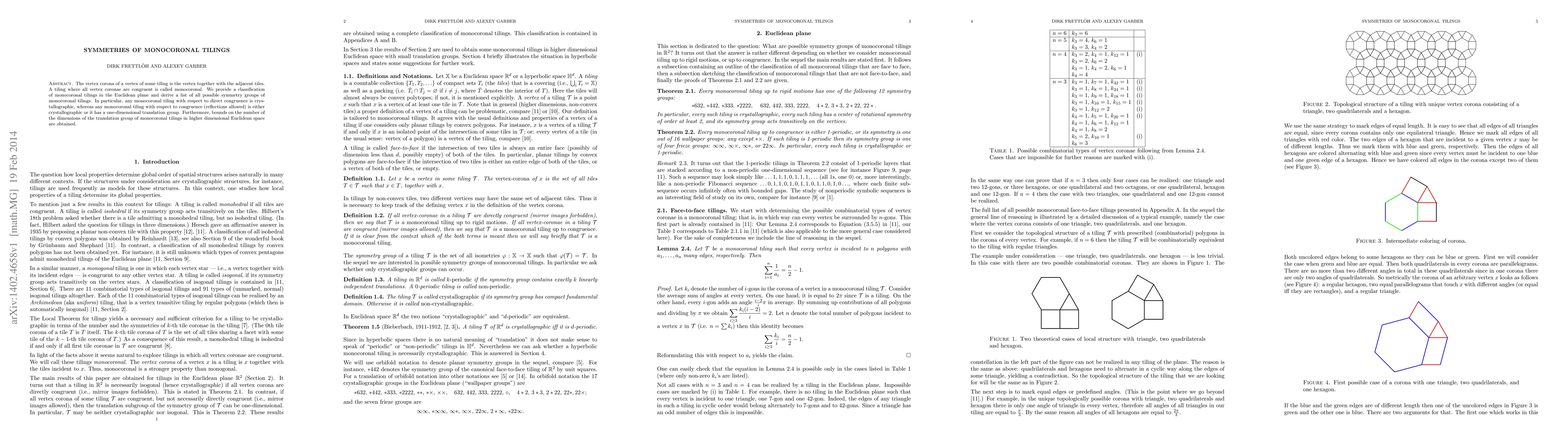 The vertex corona of a vertex of some tiling is the vertex together with the adjacent tiles. A tiling where all vertex coronae are congruent is called monocoronal. We provide a classification of monocoronal tilings in the Euclidean plane and derive a list of all possible symmetry groups of monocoronal tilings. In particular, any monocoronal tiling with respect to direct congruence is crystallographic, whereas any monocoronal tiling with respect to congruence (reflections allowed) is either crystallographic or it has a one-dimensional translation group. Furthermore, bounds on the number of the dimensions of the translation group of monocoronal tilings in higher dimensional Euclidean space are obtained.