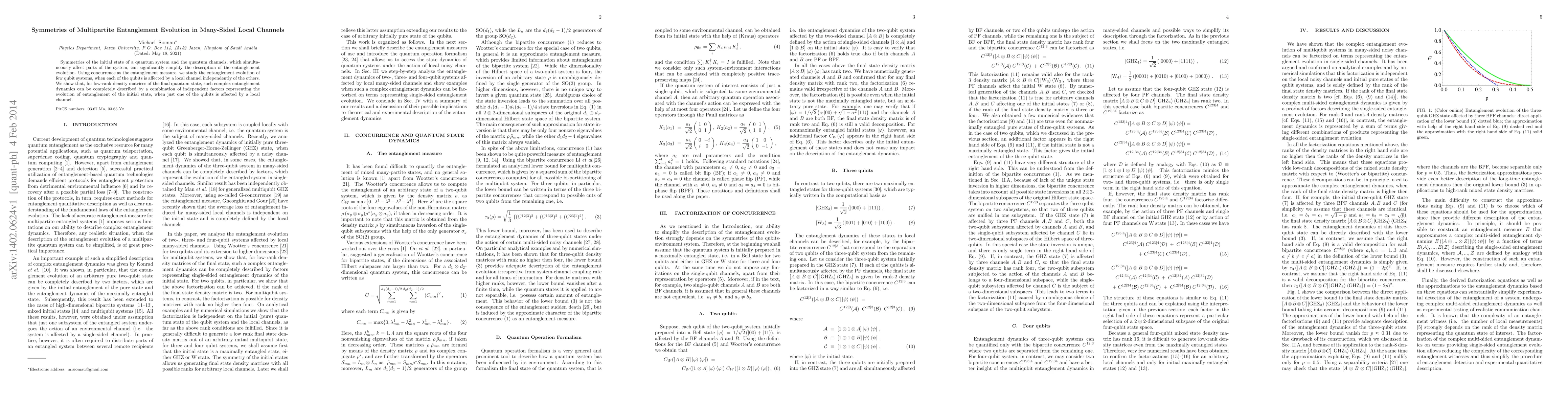 This study shows that entanglement evolution in multipartite quantum systems can be simplified by considering symmetries of the initial state and local channels, allowing for a more straightforward description of complex dynamics.