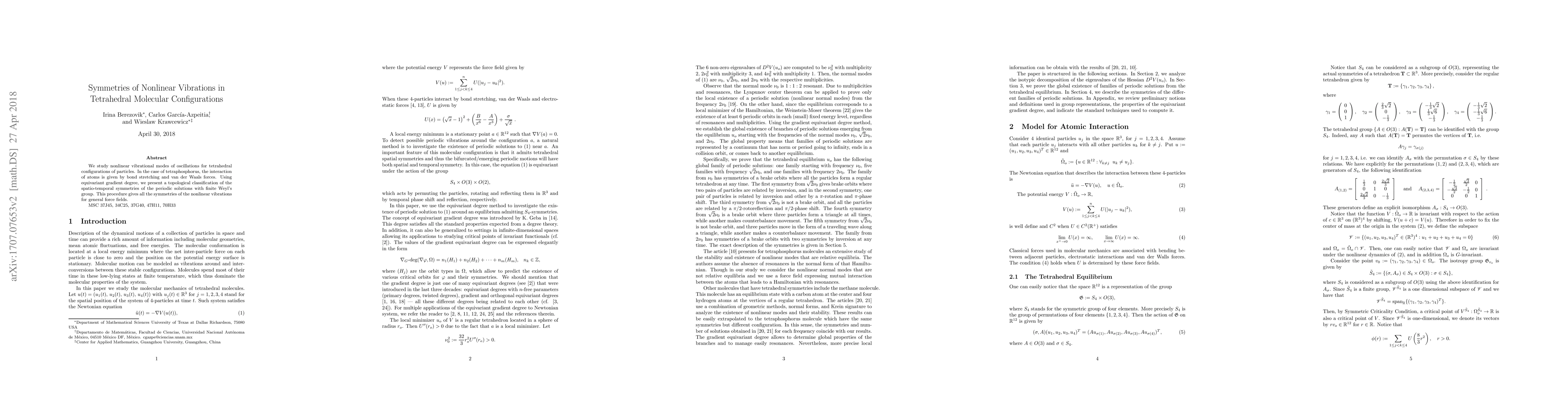 We study nonlinear vibrational modes of oscillations for tetrahedral configurations of particles. In the case of tetraphosphorus, the interaction of atoms is given by bond stretching and van der Waals forces. Using equivariant gradient degree, we present a full topological classification of the spatio-temporal symmetries of the periodic solutions. This procedure gives all the symmetries of the nonlinear vibrations for general force fields.