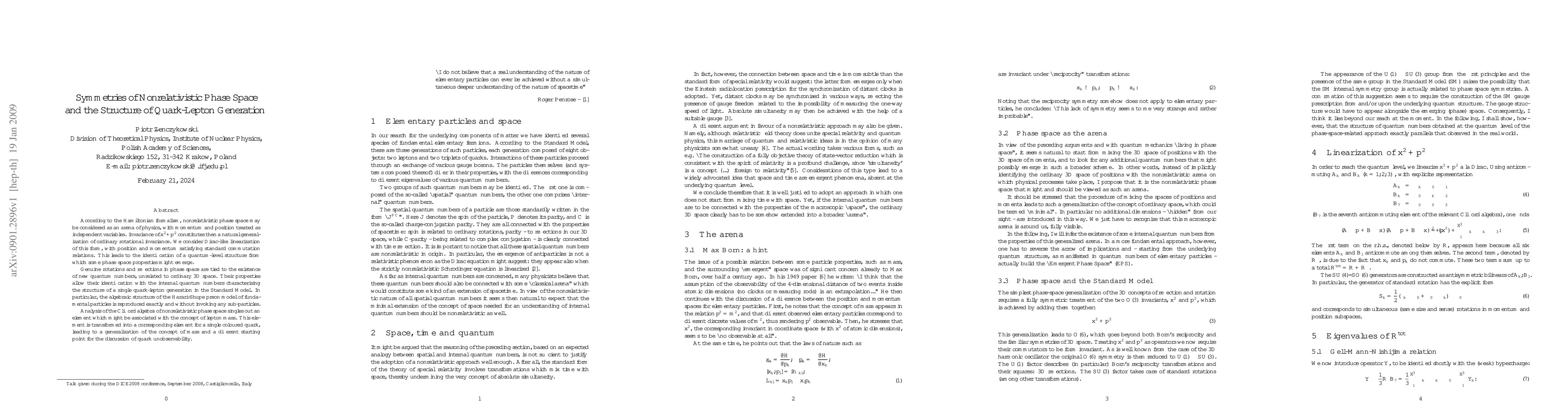 According to the Hamiltonian formalism, nonrelativistic phase space may be considered as an arena of physics, with momentum and position treated as independent variables. Invariance of x^2+p^2 constitutes then a natural generalization of ordinary rotational invariance. We consider Dirac-like linearization of this form, with position and momentum satisfying standard commutation relations. This leads to the identification of a quantum-level structure from which some phase space properties might emerge. Genuine rotations and reflections in phase space are tied to the existence of new quantum numbers, unrelated to ordinary 3D space. Their properties allow their identification with the internal quantum numbers characterising the structure of a single quark-lepton generation in the Standard Model. In particular, the algebraic structure of the Harari-Shupe preon model of fundamental particles is reproduced exactly and without invoking any subparticles. Analysis of the Clifford algebra of nonrelativistic phase space singles out an element which might be associated with the concept of lepton mass. This element is transformed into a corresponding element for a single coloured quark, leading to a generalization of the concept of mass and a different starting point for the discussion of quark unobservability.