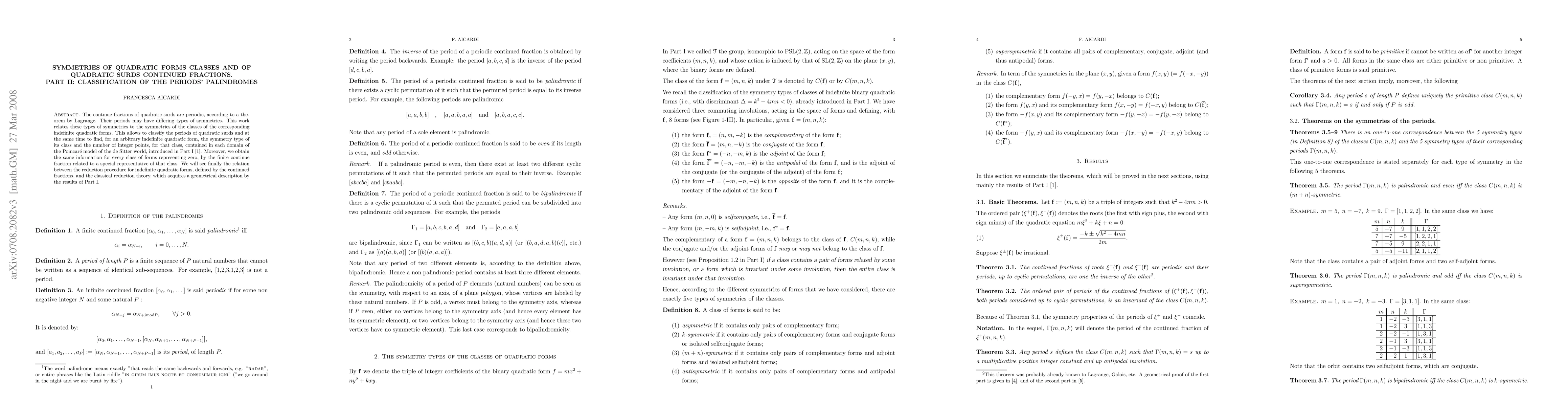 The continue fractions of quadratic surds are periodic, according to a theorem by Lagrange. Their periods may have differing types of symmetries. This work relates these types of symmetries to the symmetries of the classes of the corresponding indefinite quadratic forms. This allows to classify the periods of quadratic surds and at the same time to find, for an arbitrary indefinite quadratic form, the symmetry type of its class and the number of integer points, for that class, contained in each domain of the Poincare' model of the de Sitter world, introduced in Part I. Moreover, we obtain the same information for every class of forms representing zero, by the finite continue fraction related to a special representative of that class. We will see finally the relation between the reduction procedure for indefinite quadratic forms, defined by the continued fractions, and the classical reduction theory, which acquires a geometrical description by the results of Part I.