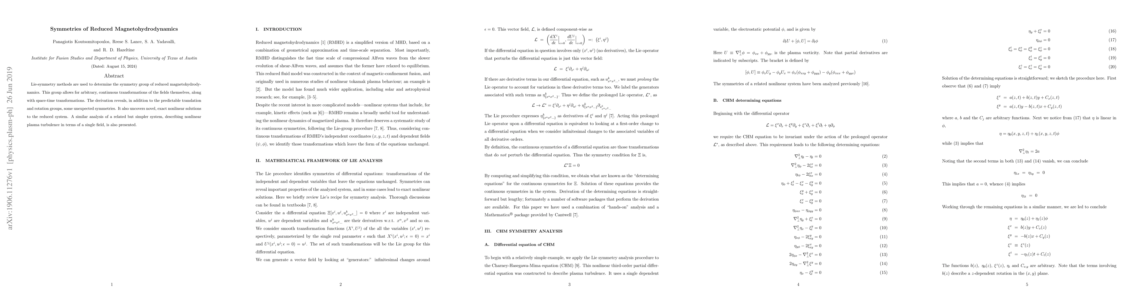 Researchers discovered unexpected symmetries in reduced magnetohydrodynamics using Lie-symmetry methods, revealing novel exact nonlinear solutions to the system.