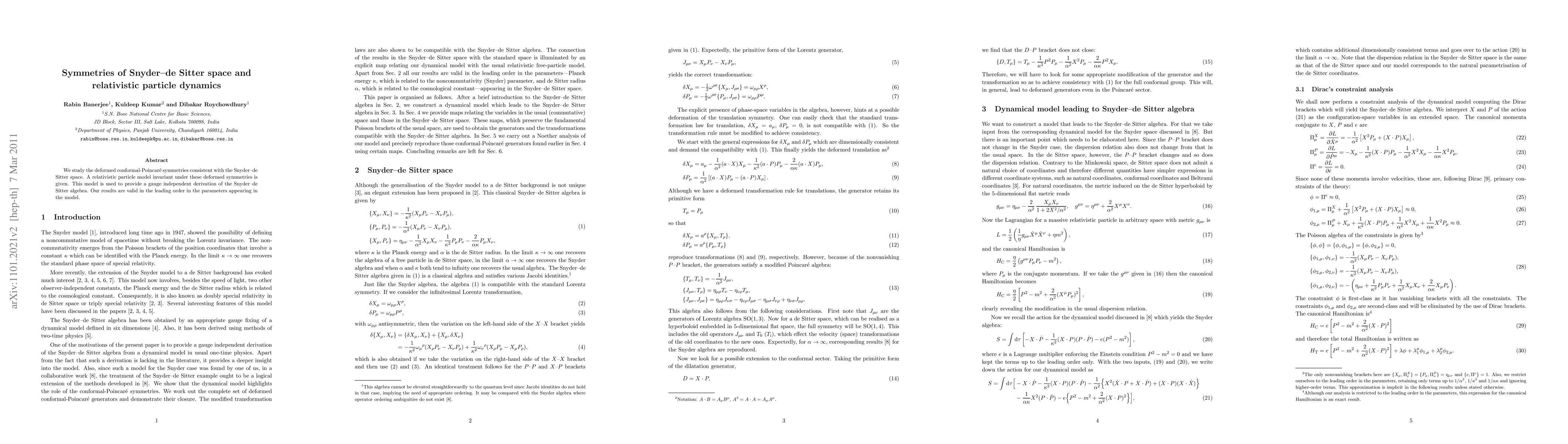 This paper investigates the symmetries of Snyder-de Sitter space, focusing on deformed conformal-Poincaré symmetries. It presents a relativistic particle model invariant under these symmetries and uses it to derive the Snyder-de Sitter algebra in leading order.