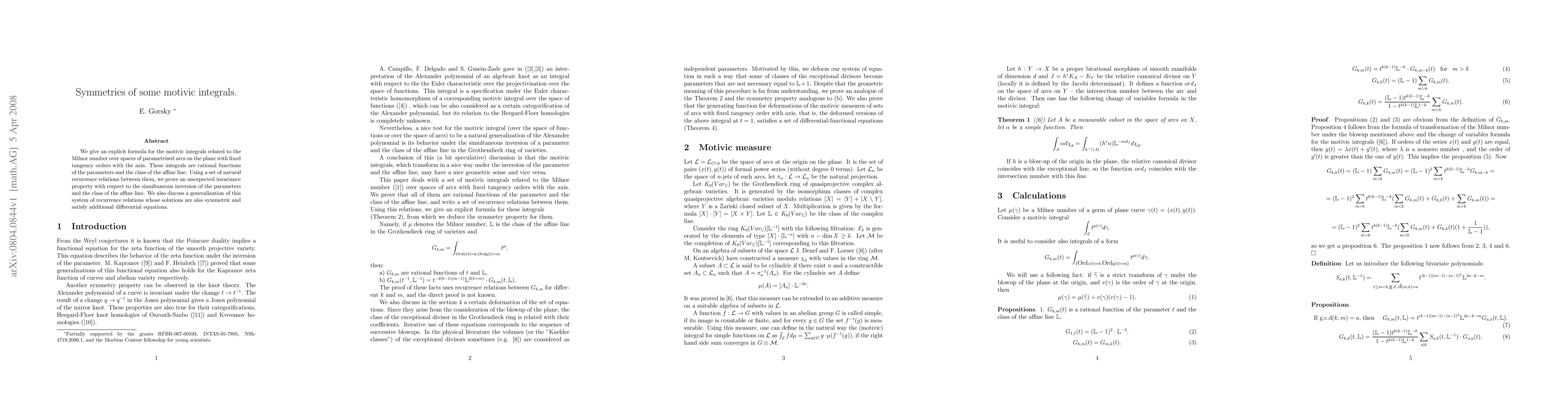We give an explicit formula for the motivic integrals related to the Milnor number over spaces of parametrised arcs on the plane with fixed tangency orders with the axis. These integrals are rational functions of the parameters and the class of the affine line. Using a set of natural recurrence relations between them, we prove an unexpected invariance property with respect to the simultaneous inversion of the parameters and the class of the affine line. We also discuss a generalization of this system of recurrence relations whose solutions are also symmetric and satisfy additional differential equations.