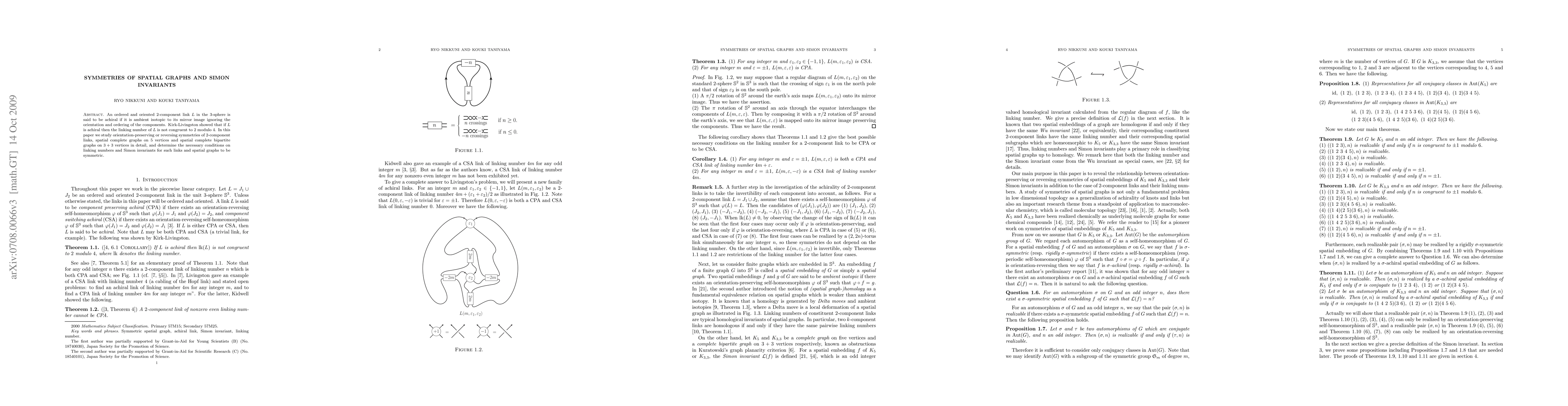 An ordered and oriented 2-component link L in the 3-sphere is said to be achiral if it is ambient isotopic to its mirror image ignoring the orientation and ordering of the components. Kirk-Livingston showed that if L is achiral then the linking number of L is not congruent to 2 modulo 4. In this paper we study orientation-preserving or reversing symmetries of 2-component links, spatial complete graphs on 5 vertices and spatial complete bipartite graphs on 3+3 vertices in detail, and determine the necessary conditions on linking numbers and Simon invariants for such links and spatial graphs to be symmetric.