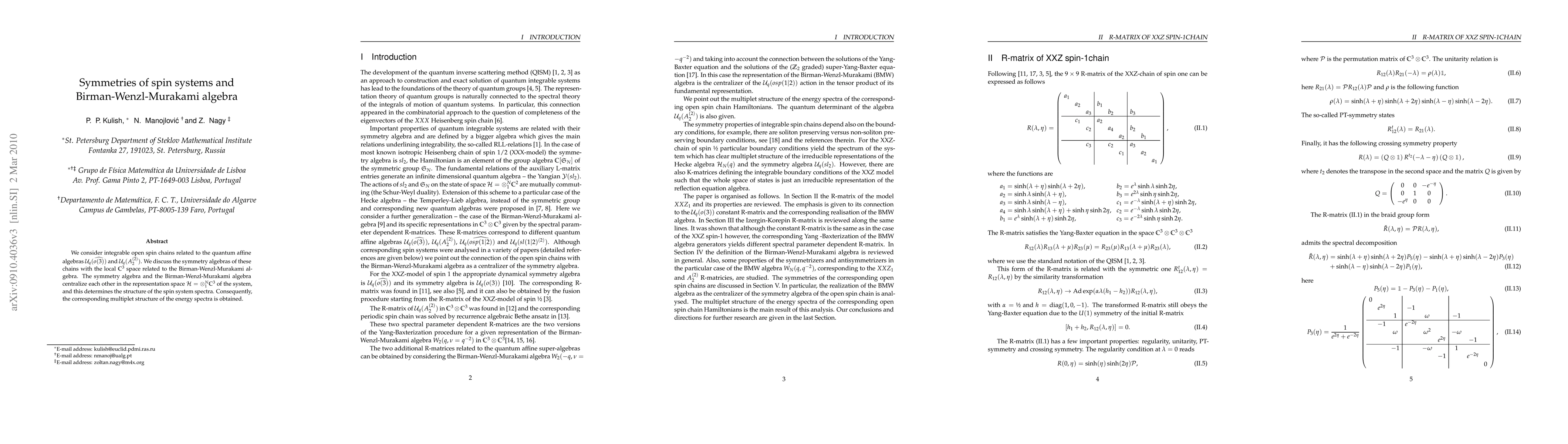 We consider integrable open spin chains related to the quantum affine algebras U_q(o(3)) and U_q(A_2^{(2)}). We discuss the symmetry algebras of these chains with the local C^3 space related to the Birman-Wenzl-Murakami algebra. The symmetry algebra and the Birman-Wenzl-Murakami algebra centralize each other in the representation space, and this defines the structure of the spin system spectra. Consequently, the corresponding multiplet structure of the energy spectra is obtained.