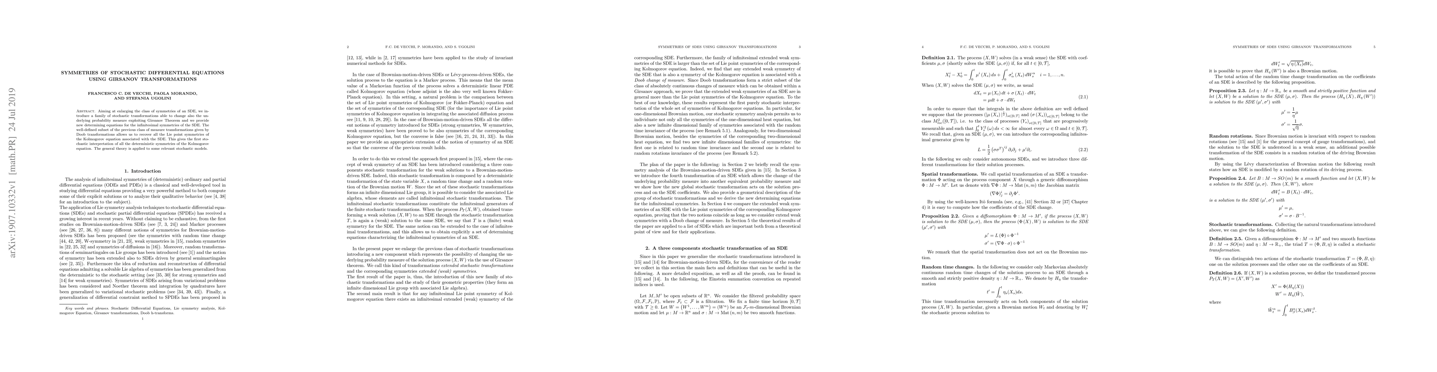 This paper expands the symmetries of stochastic differential equations (SDEs) by introducing stochastic transformations via Girsanov Theorem, providing new determining equations for infinitesimal symmetries. It also recovers all deterministic symmetries of the Kolmogorov equation associated with the SDE through Doob transformations, offering a stochastic interpretation of these symmetries.