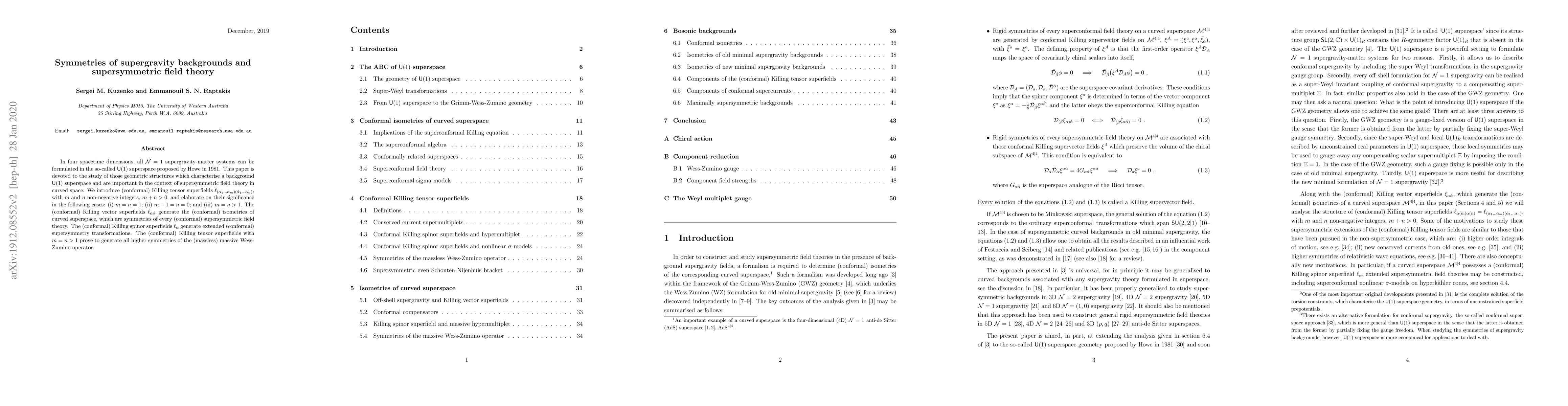 In four spacetime dimensions, all ${\cal N} =1$ supergravity-matter systems can be formulated in the so-called $\mathsf{U}(1)$ superspace proposed by Howe in 1981. This paper is devoted to the study of those geometric structures which characterise a background $\mathsf{U}(1)$ superspace and are important in the context of supersymmetric field theory in curved space. We introduce (conformal) Killing tensor superfields $\ell_{(\alpha_1 \dots \alpha_m) ({\dot \alpha}_1 \dots {\dot \alpha}_n)}$, with $m$ and $n$ non-negative integers, $m+n>0$, and elaborate on their significance in the following cases: (i) $m=n=1$; (ii) $m-1=n=0$; and (iii) $m=n>1$. The (conformal) Killing vector superfields $\ell_{\alpha \dot \alpha}$ generate the (conformal) isometries of curved superspace, which are symmetries of every (conformal) supersymmetric field theory. The (conformal) Killing spinor superfields $\ell_{\alpha }$ generate extended (conformal) supersymmetry transformations. The (conformal) Killing tensor superfields with $m=n>1$ prove to generate all higher symmetries of the (massless) massive Wess-Zumino operator.