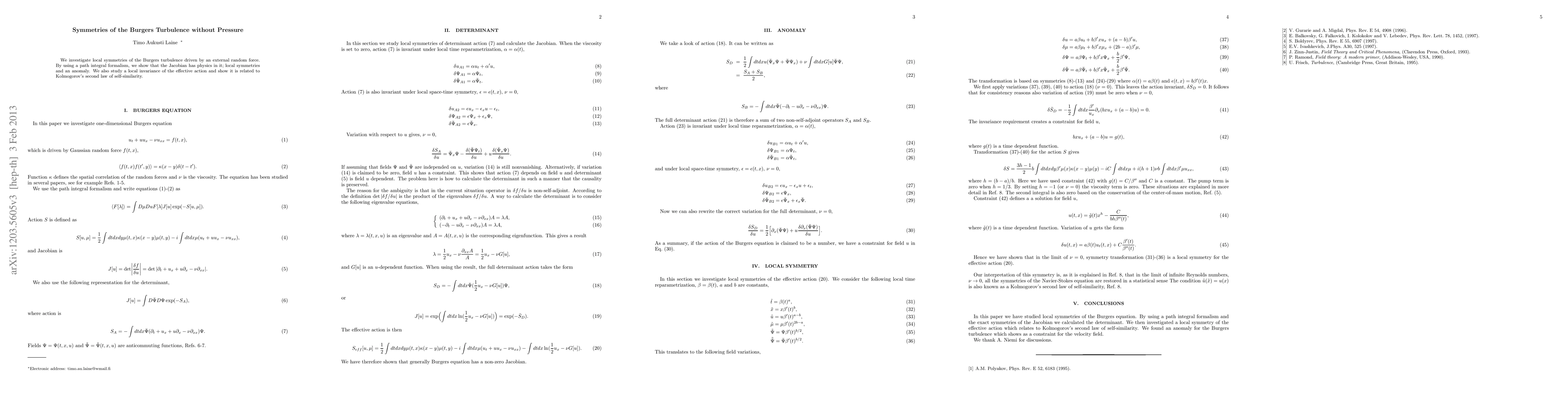 This paper explores the local symmetries of Burgers turbulence driven by random forces, revealing a Jacobian with physical implications, including local symmetries and an anomaly. It also connects the local invariance of the effective action to Kolmogorov's second law of self-similarity.