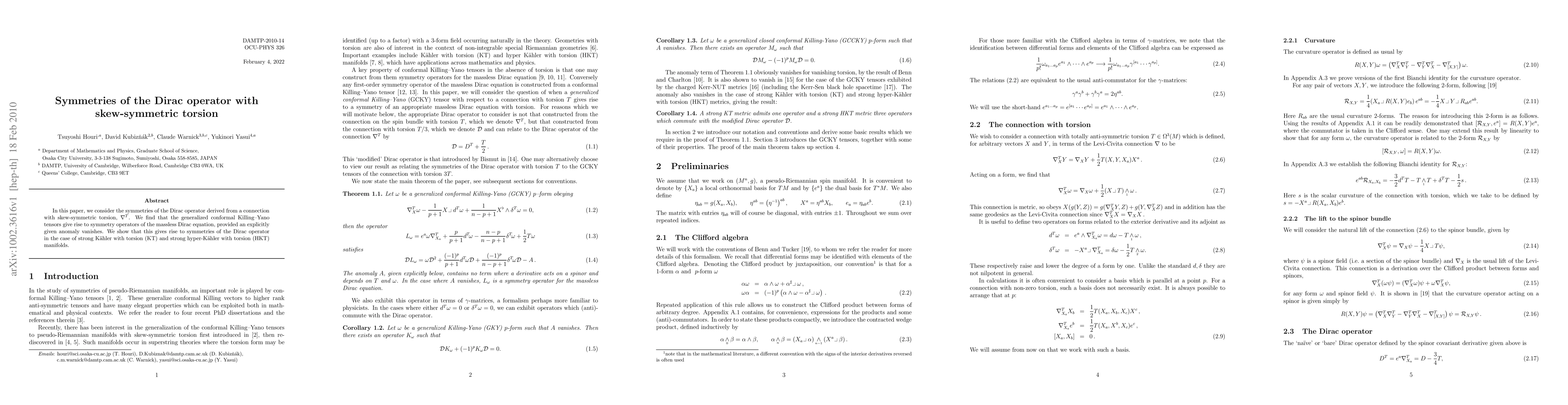 This paper investigates symmetries of the Dirac operator with skew-symmetric torsion, revealing that generalized conformal Killing-Yano tensors yield symmetry operators for the massless Dirac equation, contingent on an anomaly condition. It demonstrates these symmetries in strong Kahler with torsion (KT) and strong hyper-Kahler with torsion (HKT) manifolds.