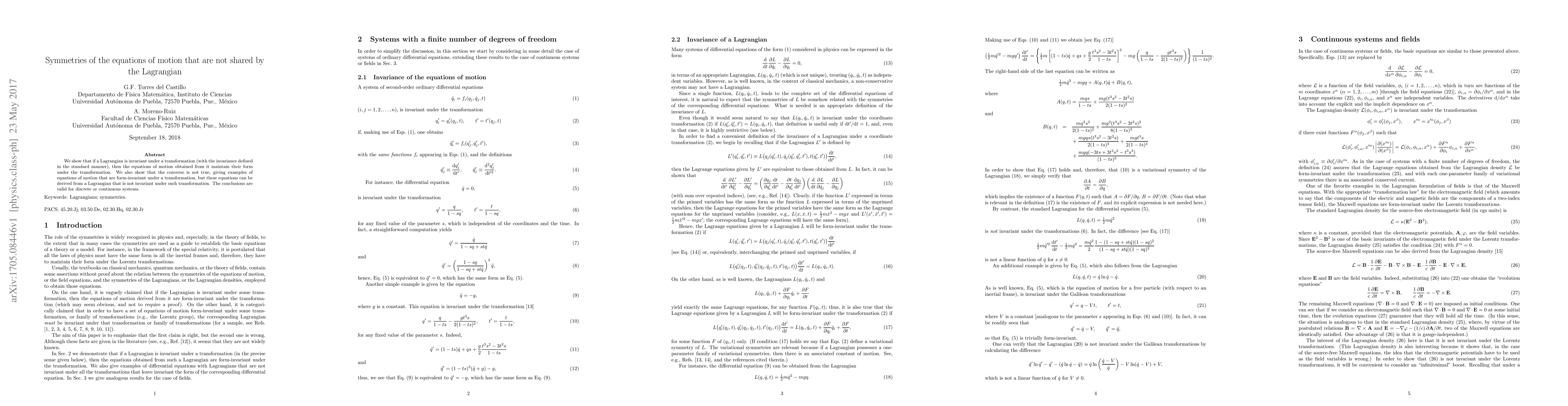 We show that if a Lagrangian is invariant under a transformation (with the invariance defined in the standard manner), then the equations of motion obtained from it maintain their form under the transformation. We also show that the converse is not true, giving examples of equations of motion that are form-invariant under a transformation, but these equations can be derived from a Lagrangian that is not invariant under such transformation. The conclusions are valid for discrete or continuous systems.