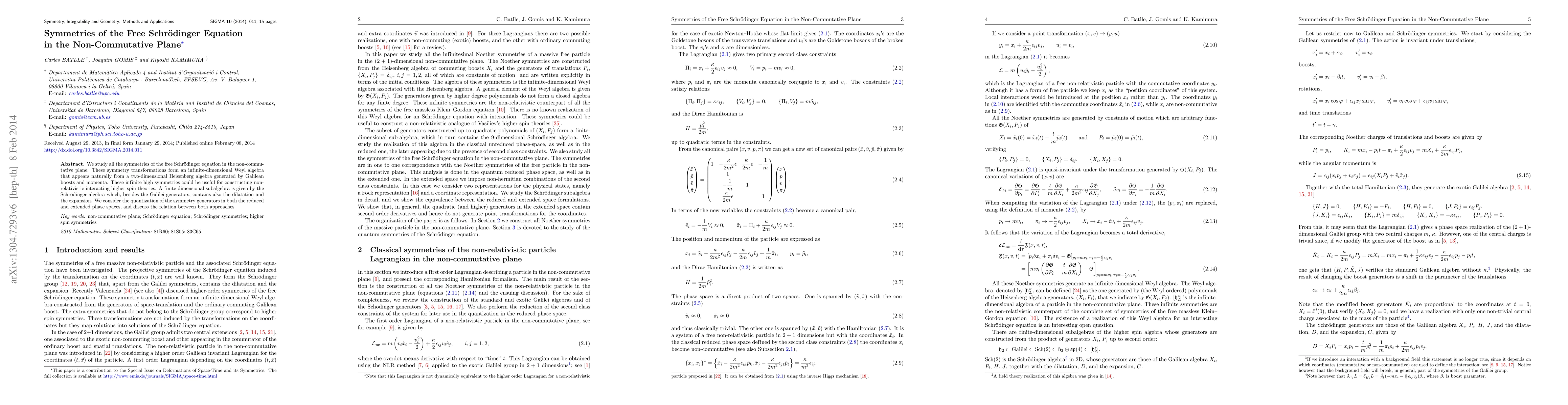 This paper investigates the symmetries of the free Schrödinger equation in a non-commutative plane, revealing an infinite-dimensional Weyl algebra derived from a two-dimensional Heisenberg algebra. It explores the quantization of these symmetries in both reduced and extended phase spaces, highlighting the potential utility in constructing non-relativistic higher spin theories.