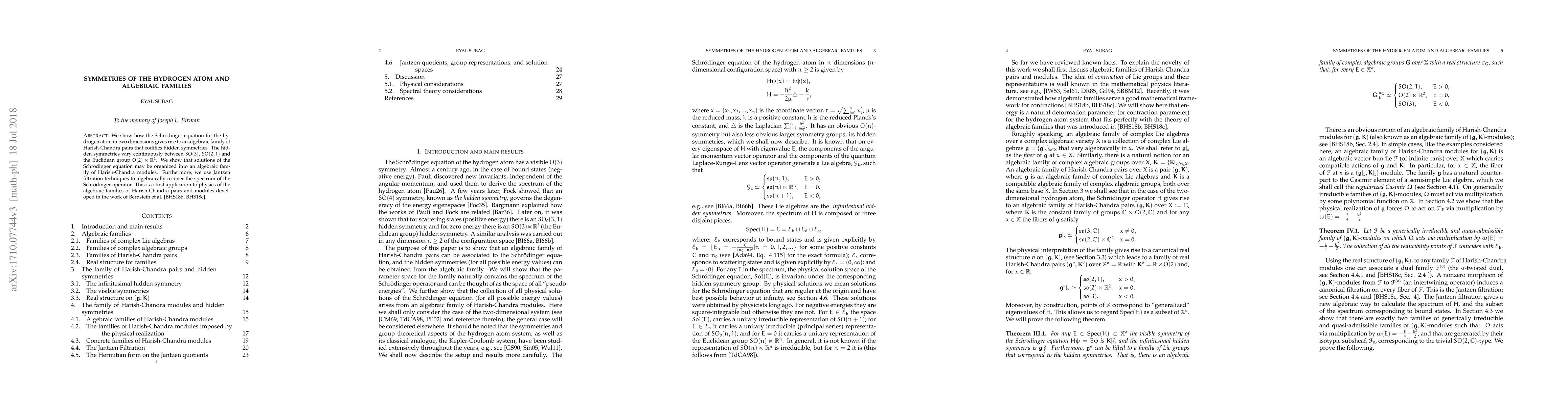 We show how the Schr\"{o}dinger equation for the hydrogen atom in two dimensions gives rise to an algebraic family of Harish-Chandra pairs that codifies hidden symmetries. The hidden symmetries vary continuously between $SO(3)$, $SO(2,1)$ and the Euclidean group $O(2)\ltimes \mathbb{R}^2$. We show that solutions of the Schr\"{o}dinger equation may be organized into an algebraic family of Harish-Chandra modules. Furthermore, we use Jantzen filtration techniques to algebraically recover the spectrum of the Schr\"{o}dinger operator. This is a first application to physics of the algebraic families of Harish-Chandra pairs and modules developed in the work of Bernstein et al. [Int. Math. Res. Notices, rny147 (2018); rny146 (2018)].